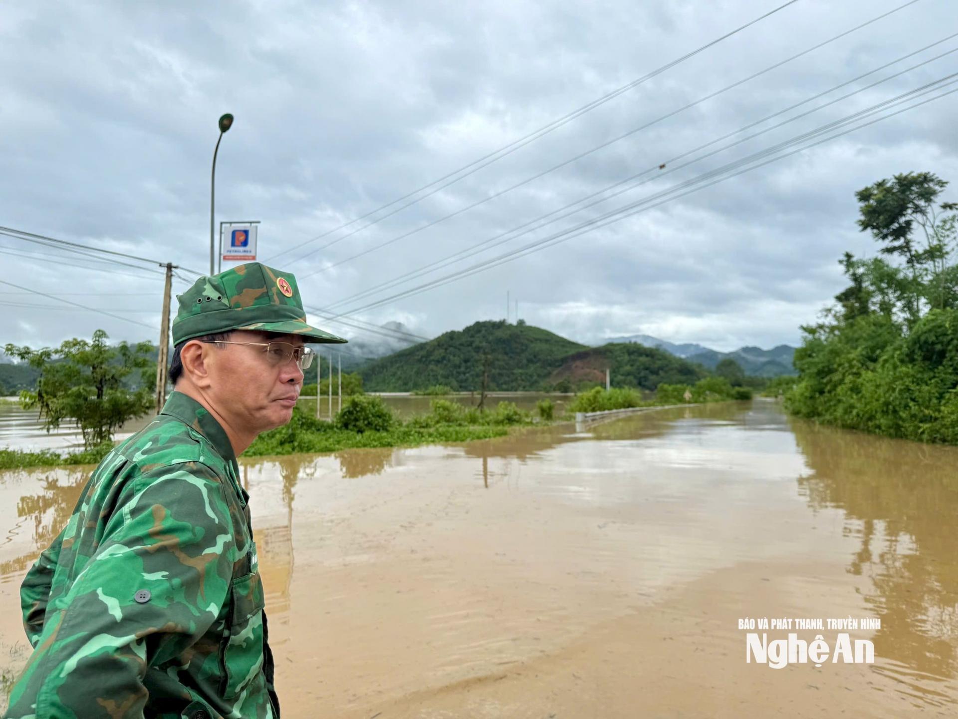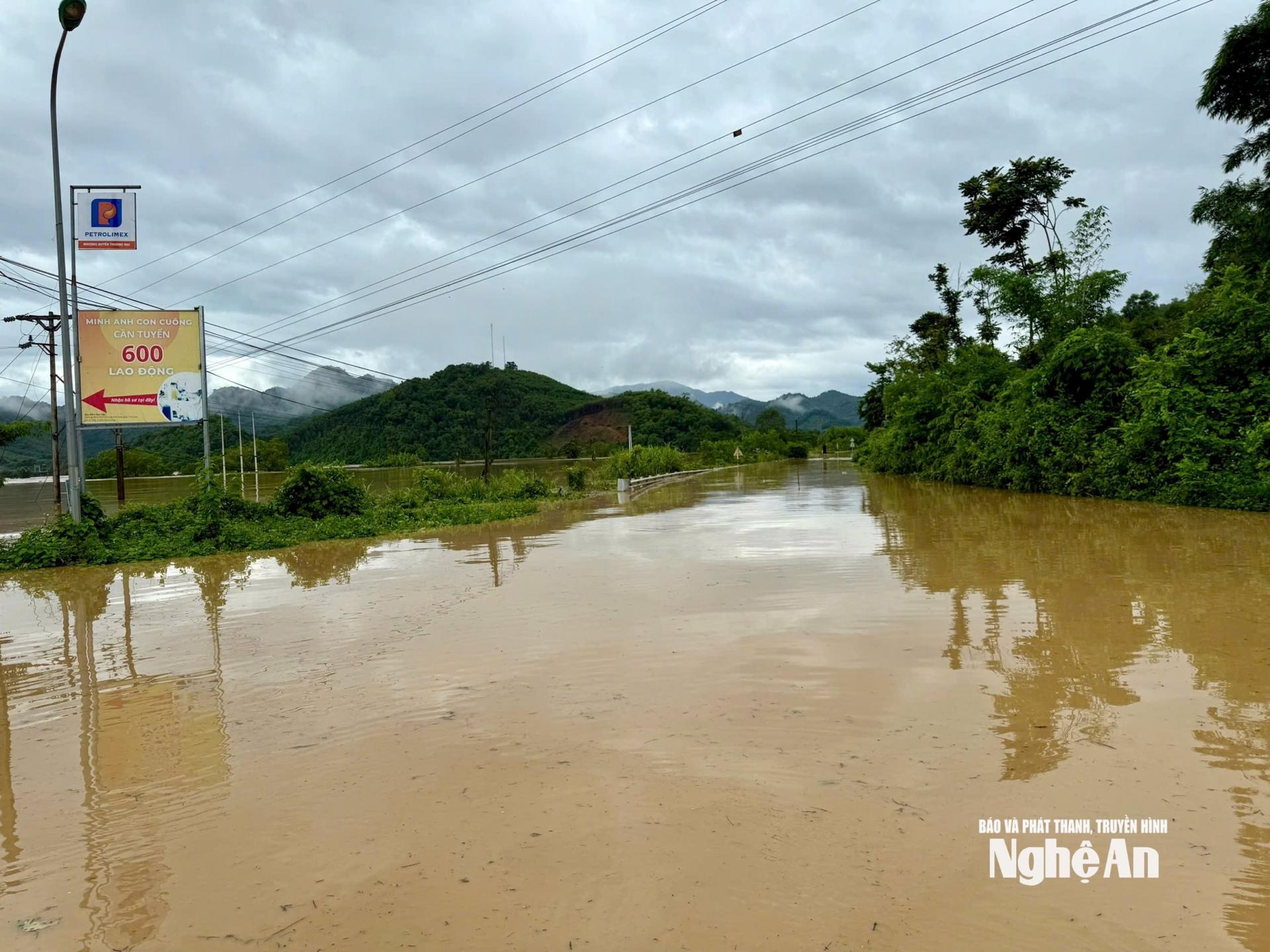 Đến 9 giờ 30 phút ngày 23/7, nhiều đoạn Quốc lộ 7 ngập sâu. Trong đó đoạn qua xã Con Cuông vẫn ngập hơn 1m, các đoàn công tác và người dân chưa thể đi qua.