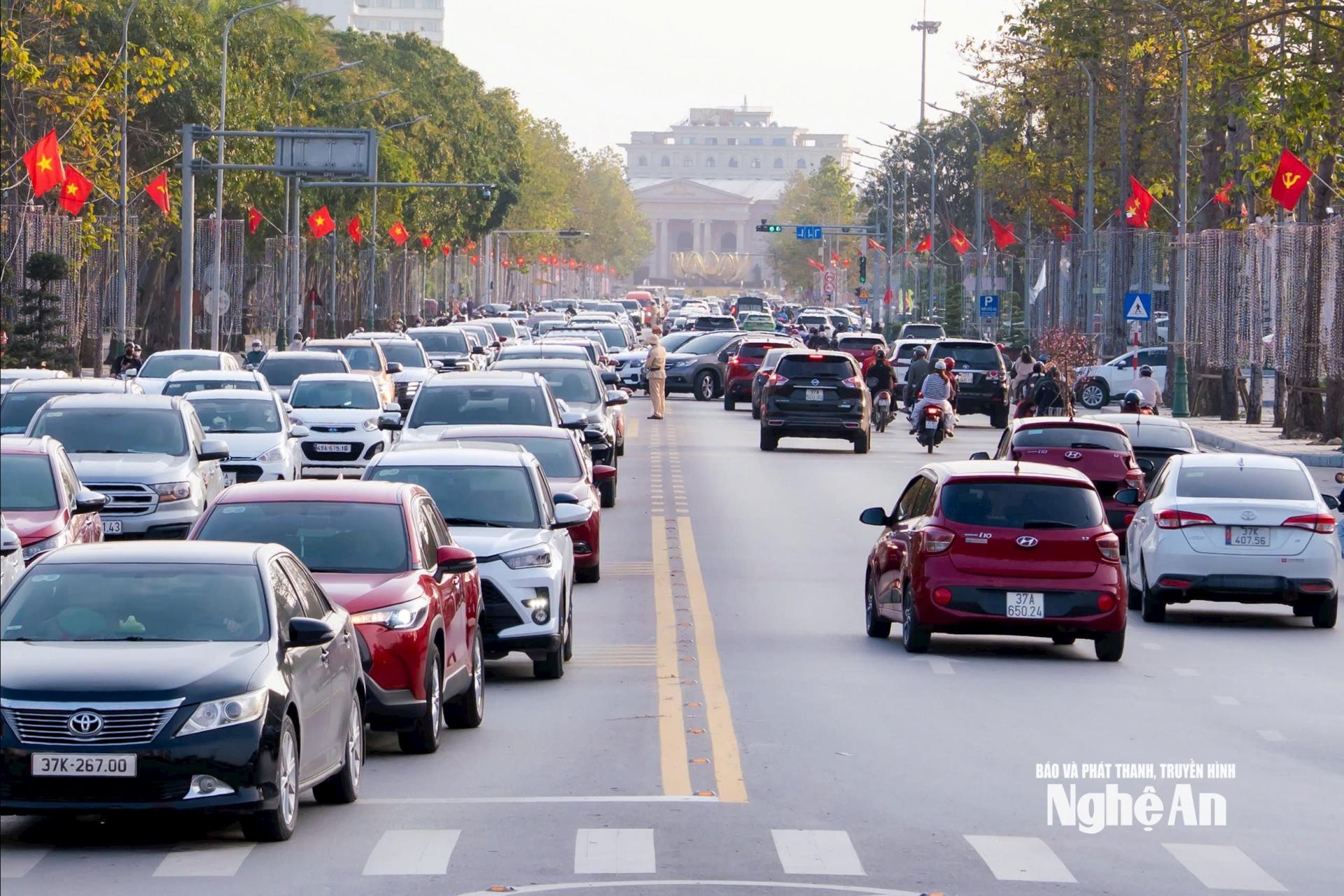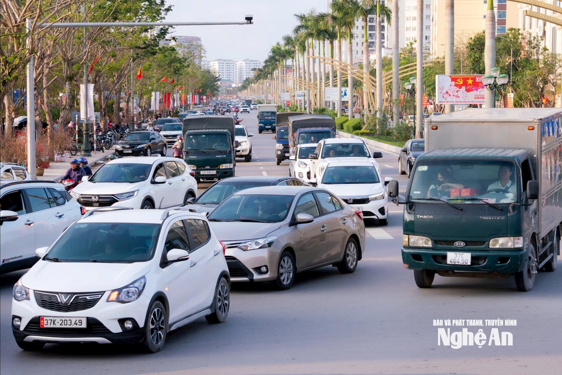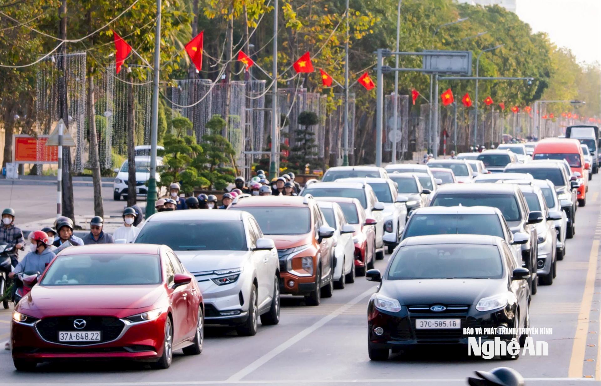 | Lưu lượng phương tiện tăng đột biến khiến nhiều tuyến đường trung tâm TP Vinh (cũ) rơi vào tình trạng quá tải cục bộ. Ảnh: Đặng Cường |
