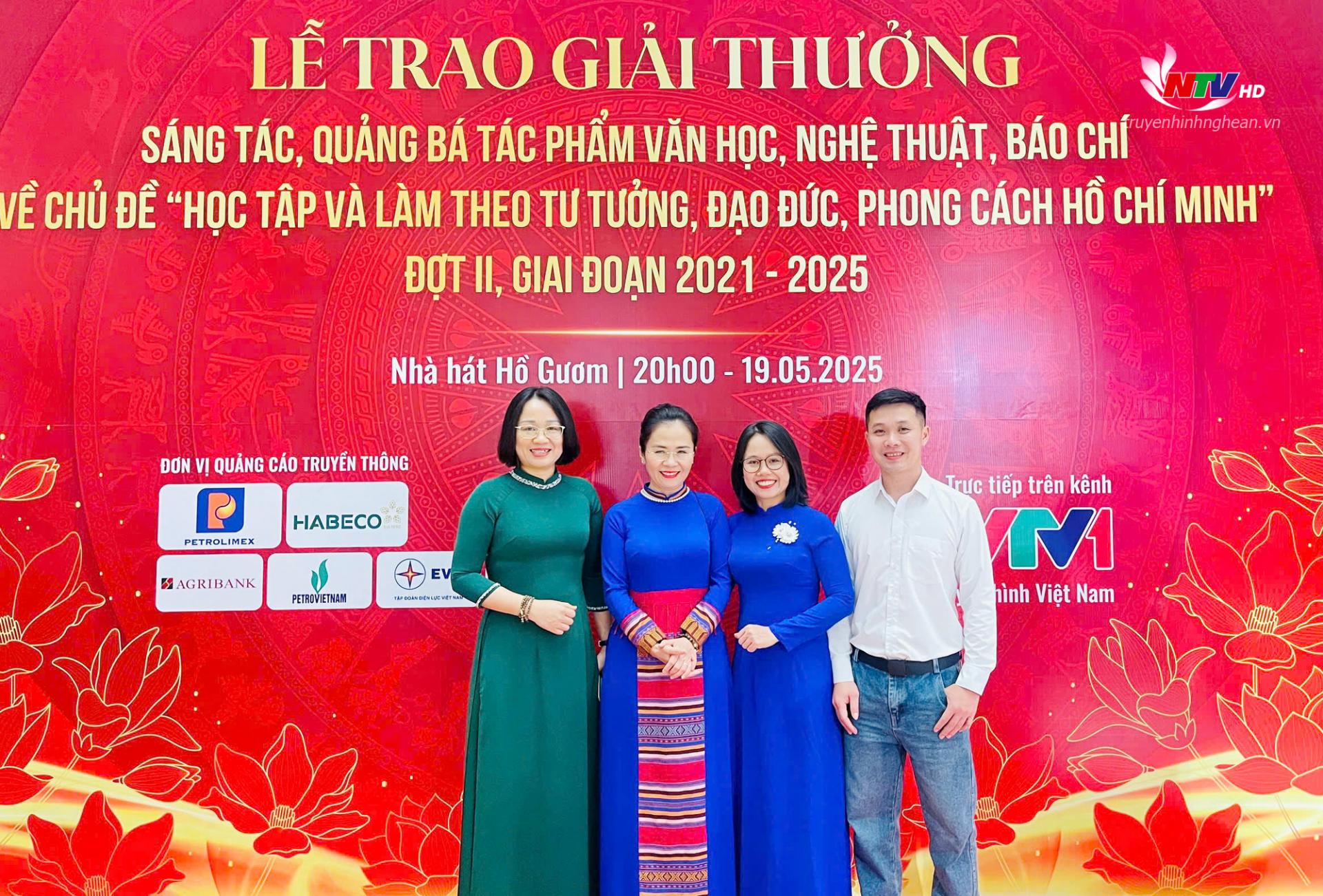 | Nhà báo Khánh Ly (Đài PT-TH Nghệ An) đại diện êkip Phim tài liệu “Di sản từ trái tim” nhận Giải A toàn quốc Giải thưởng sáng tác, quảng bá tác phẩm văn học, nghệ thuật, báo chí về chủ đề "Học tập và làm theo tư tưởng, đạo đức, phong cách Hồ Chí Minh”. |