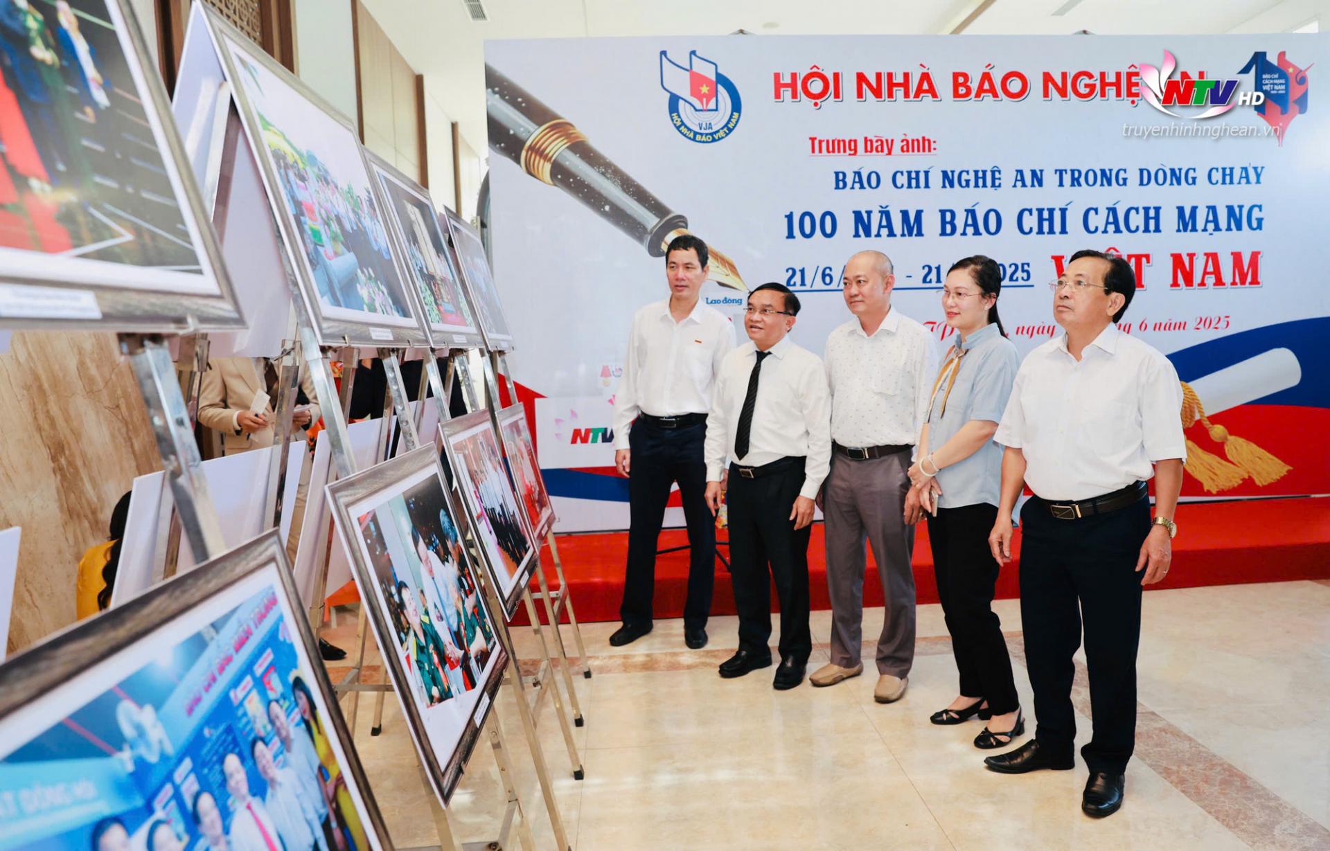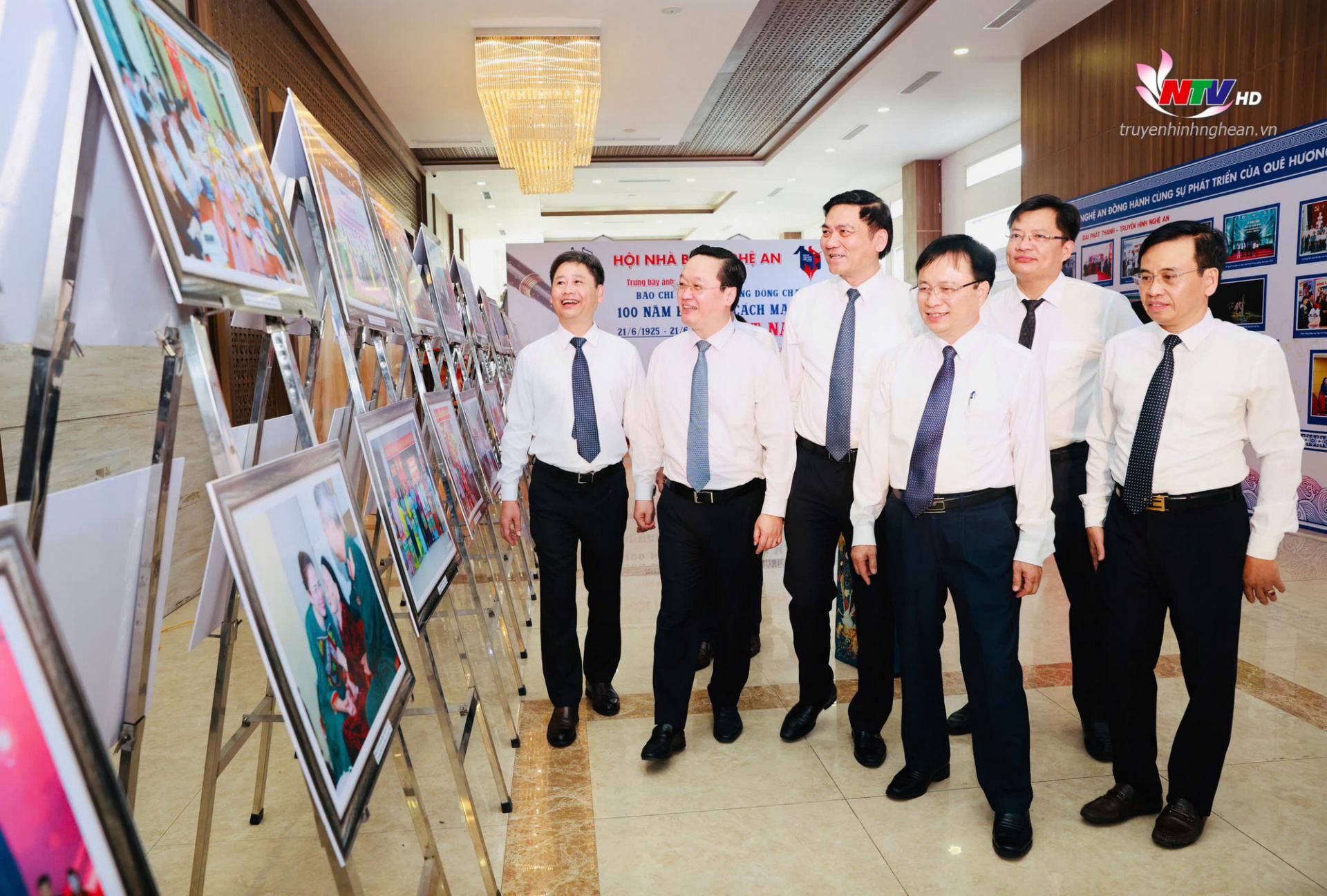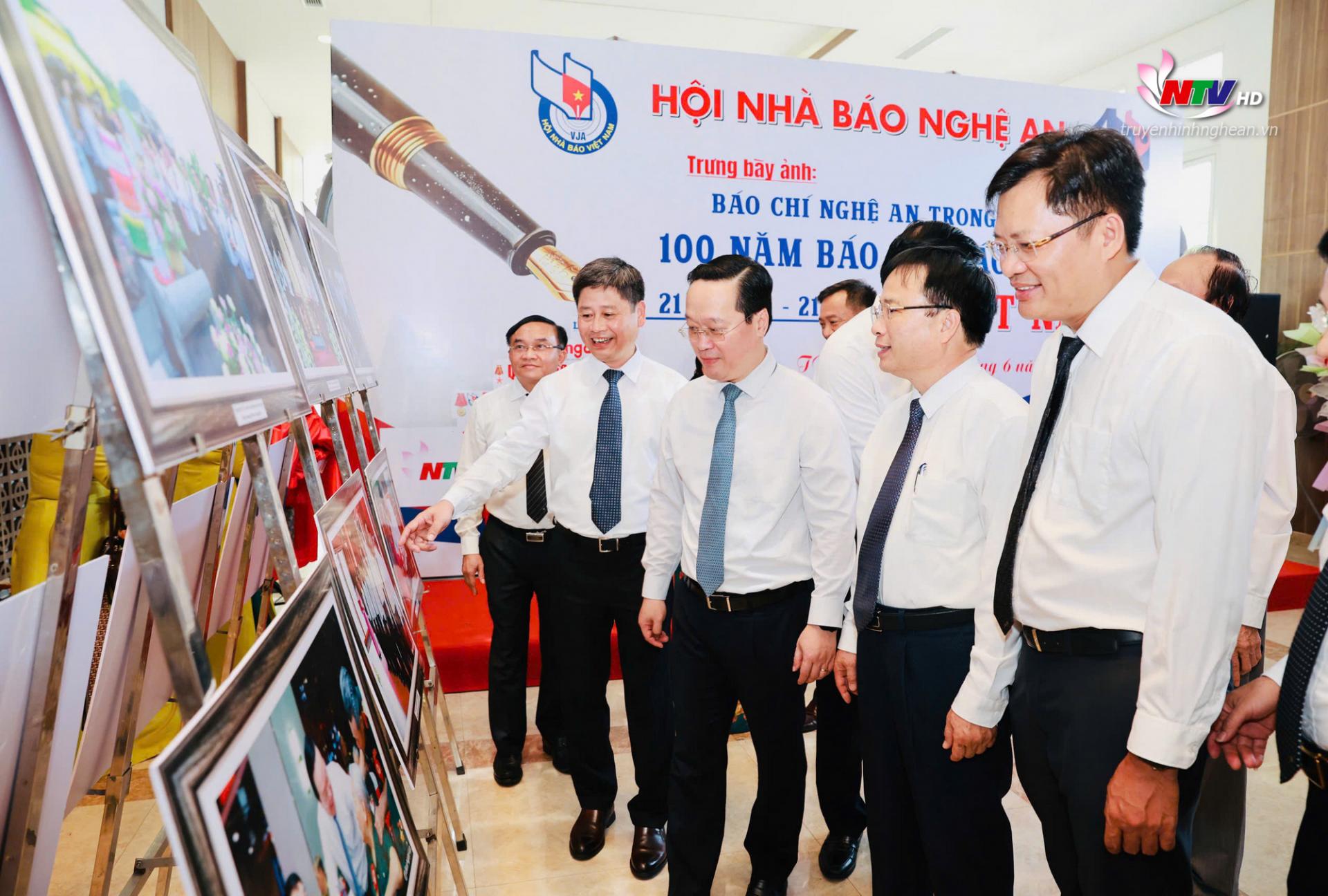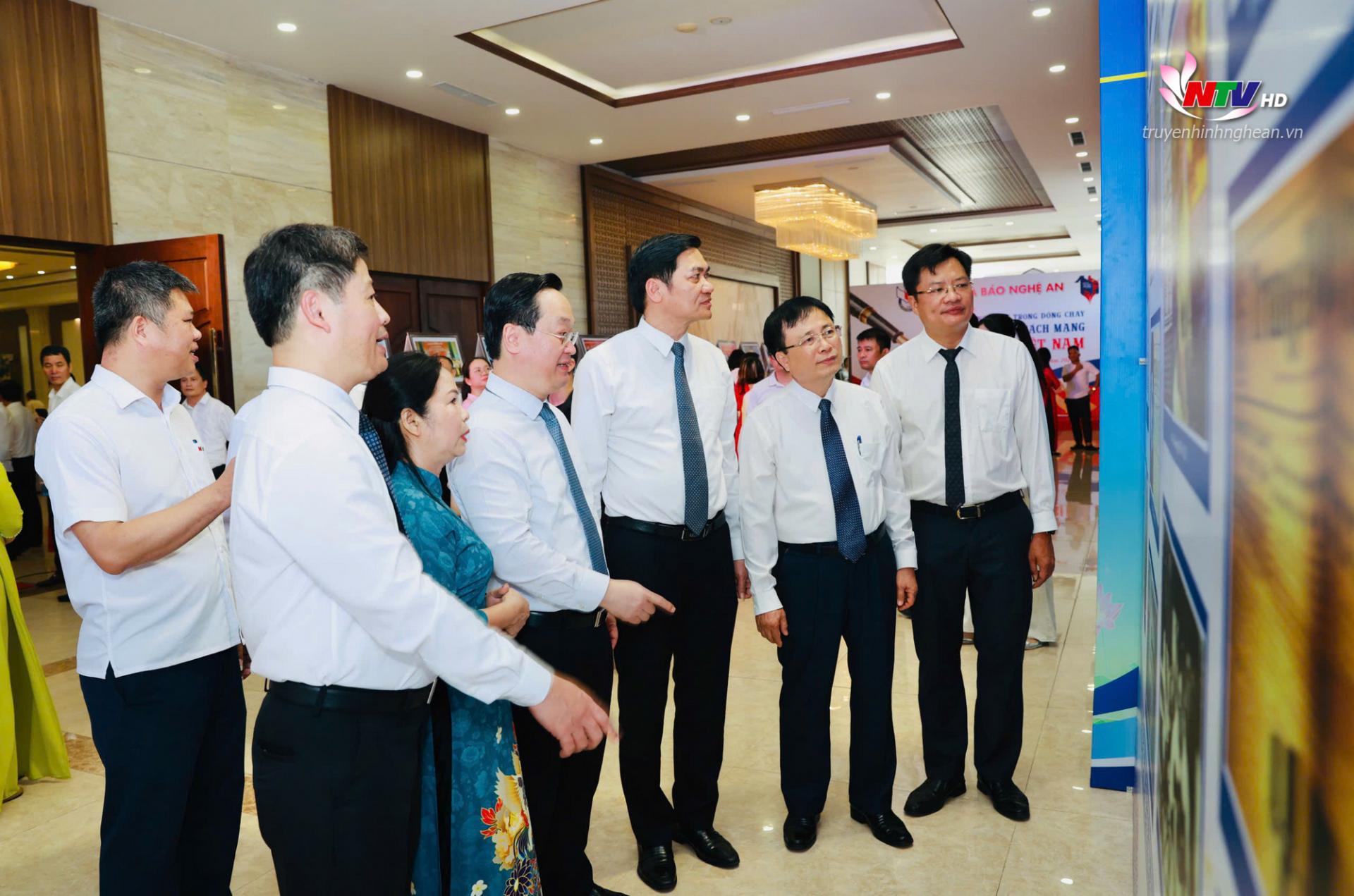 | Các đồng chí lãnh đạo tỉnh và các đại biểu tham quan trưng bày ảnh “Báo chí Nghệ An trong dòng chảy 100 năm Báo chí Cách mạng Việt Nam”. |
