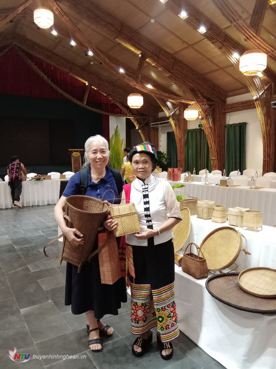 | Bà Vi Thị Hồng chụp cùng du khách nước ngoài trong một lần đưa sản phẩm đi tham gia triển lãm ở Quảng Nam. |