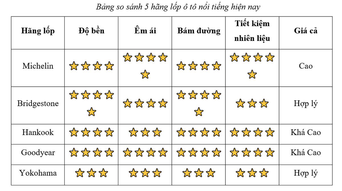 Bất chấp sự xuất hiện của rất nhiều loại lốp ô tô trên thị trường, các dòng sản phẩm chất lượng cao của 5 hãng lốp ô tô gồm Michelin, Bridgestone, Hankook, Goodyear và Yokohama vẫn là sự lựa chọn hàng đầu của đông đảo người dùng.