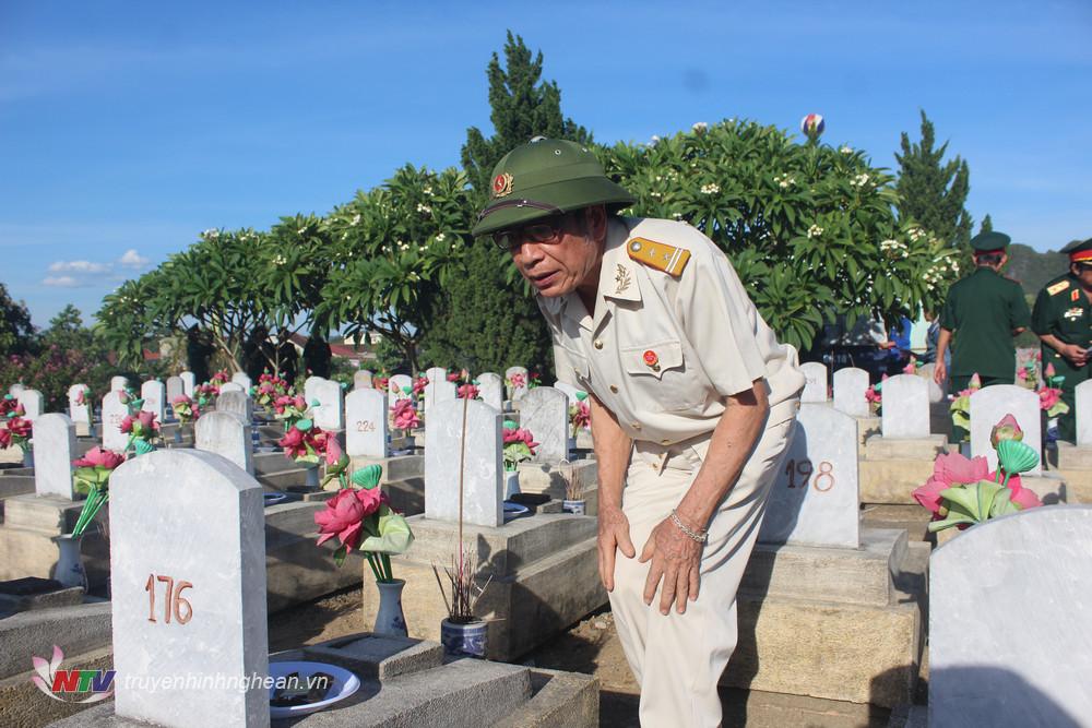 | Anh hùng Vi Đức Cường soi ngắm mộ đồng đội tại nghĩa trang Liệt sĩ Việt Lào huyện Anh Sơn. |