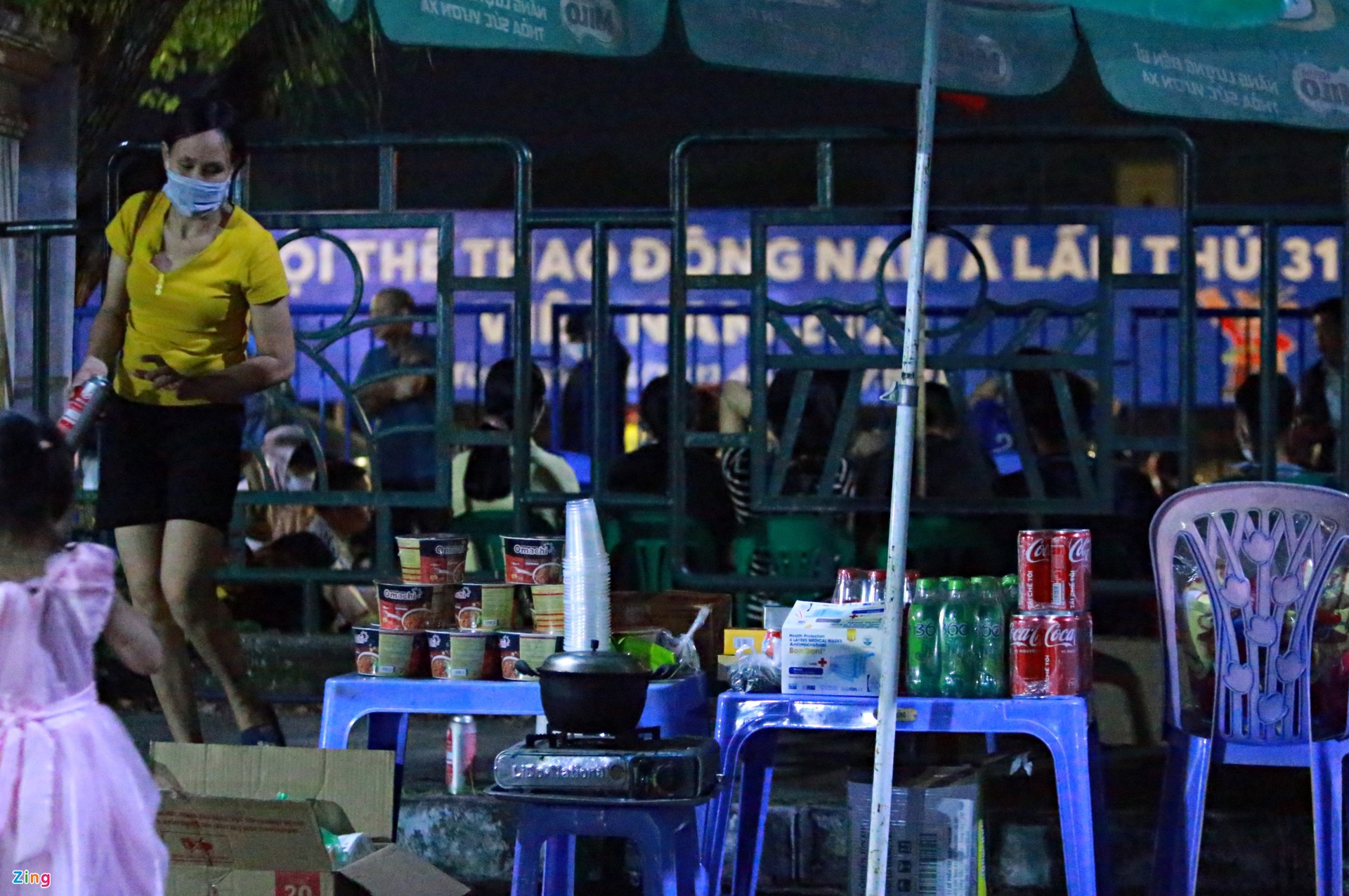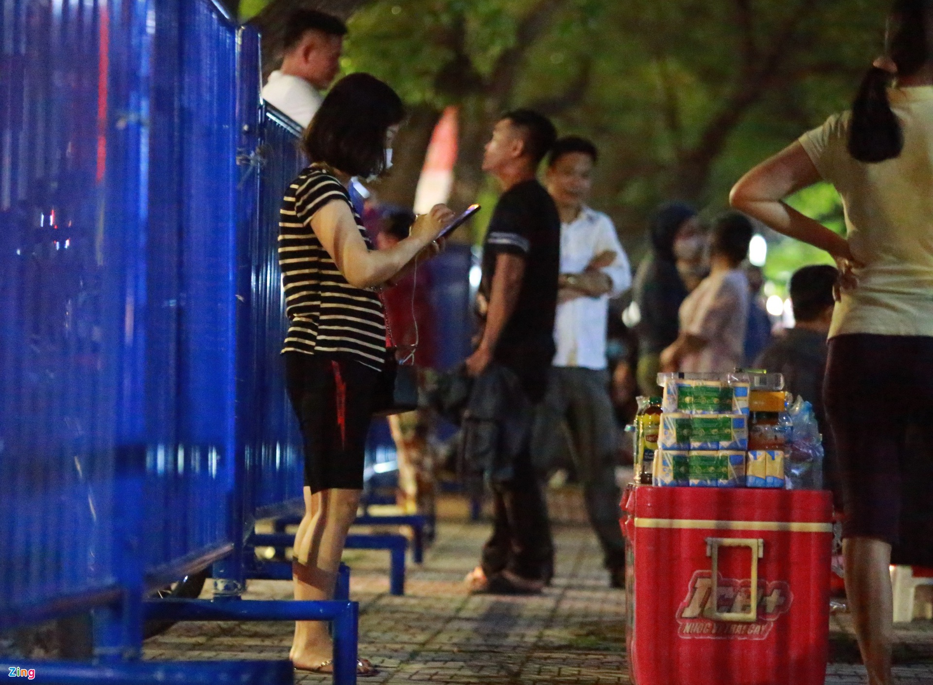 | Quầy nước di động được một phụ nữ tranh thủ mang vào trong khu vực chờ đợi để phục vụ nhu cầu của bà con thức xuyên đêm để săn vé. Mỳ gói và các món ăn nhanh cũng được phục vụ ở khu vực phía trong khuôn viên nhà thi đấu. |