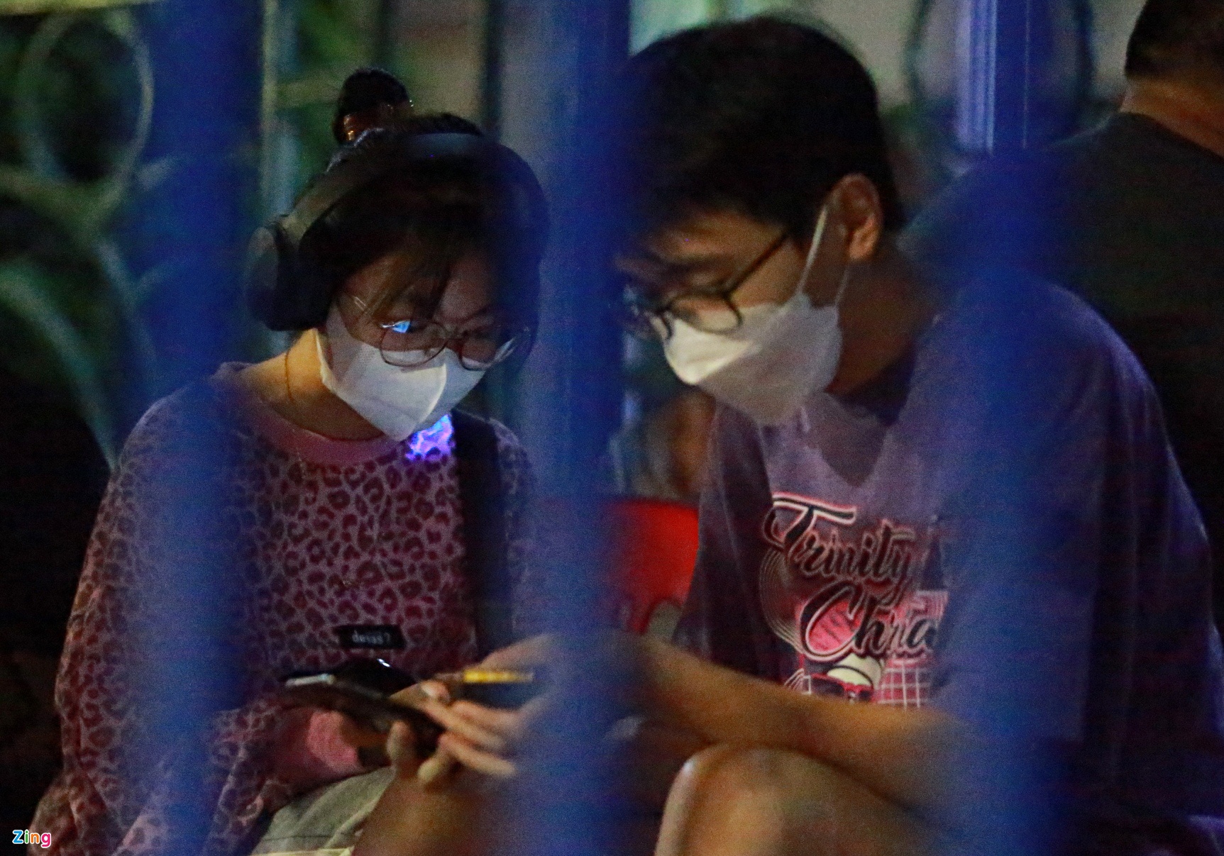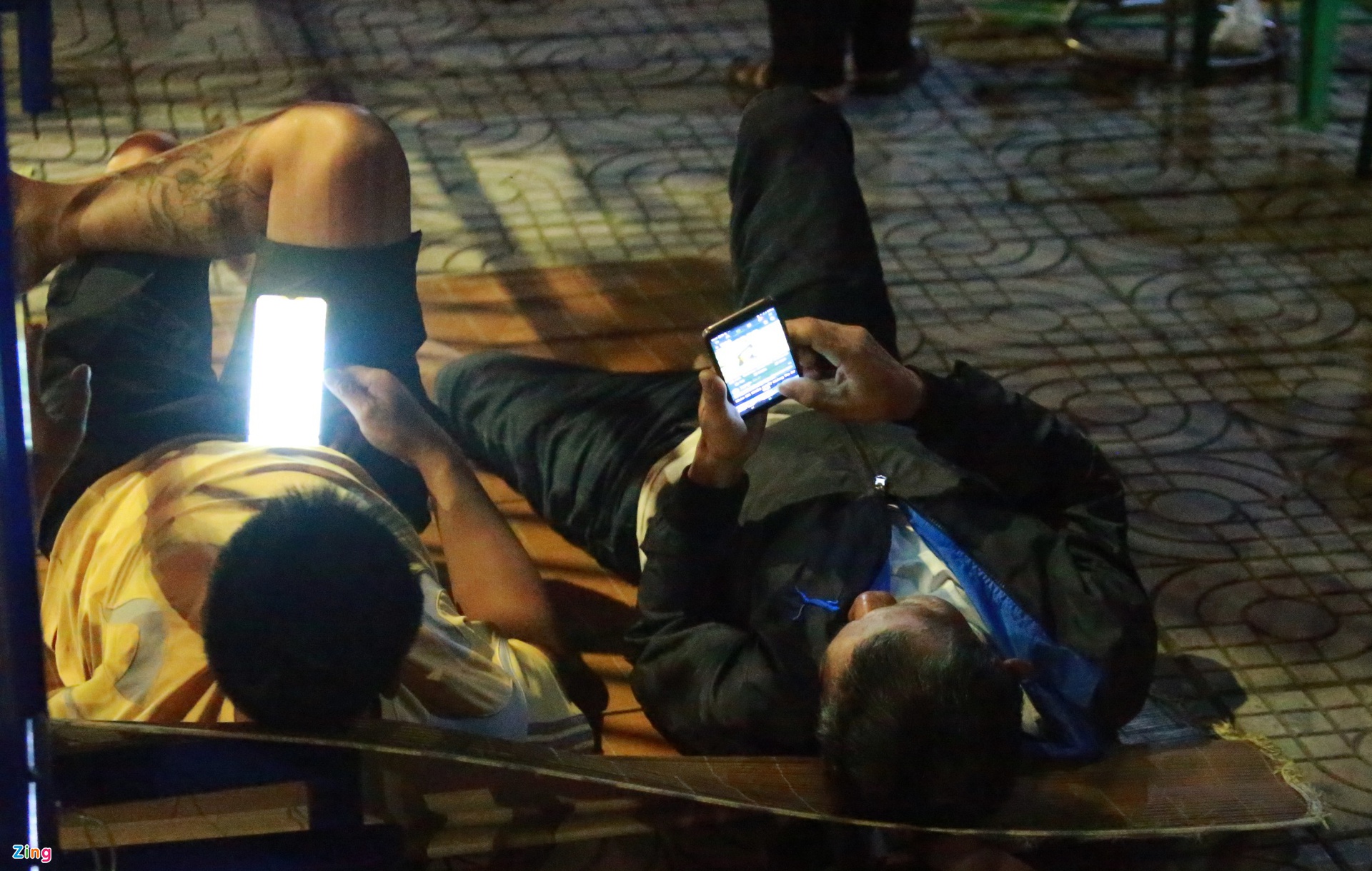| Một cặp bạn trẻ hiếm hoi thức cùng nhau qua đêm 2/5. Họ chọn cách chơi game, đeo headphone thư giãn trong khi các ông bà lão và phụ nữ trung niên bàn chuyện mua vé ồn ào. |