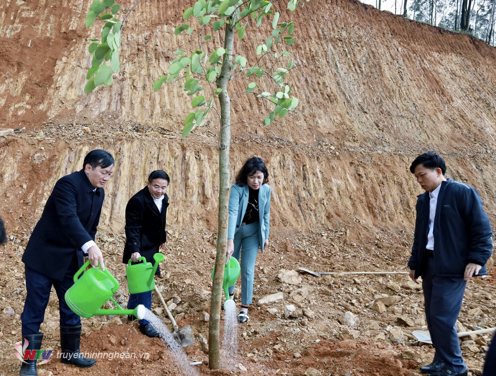| Lãnh đạo huyện Con Cuông đham gia trồng các cây xanh. |