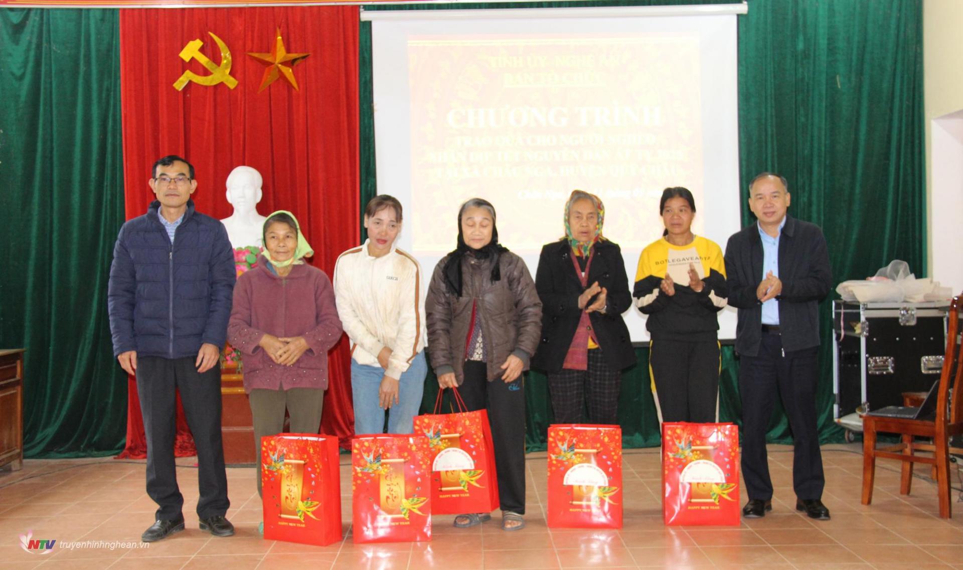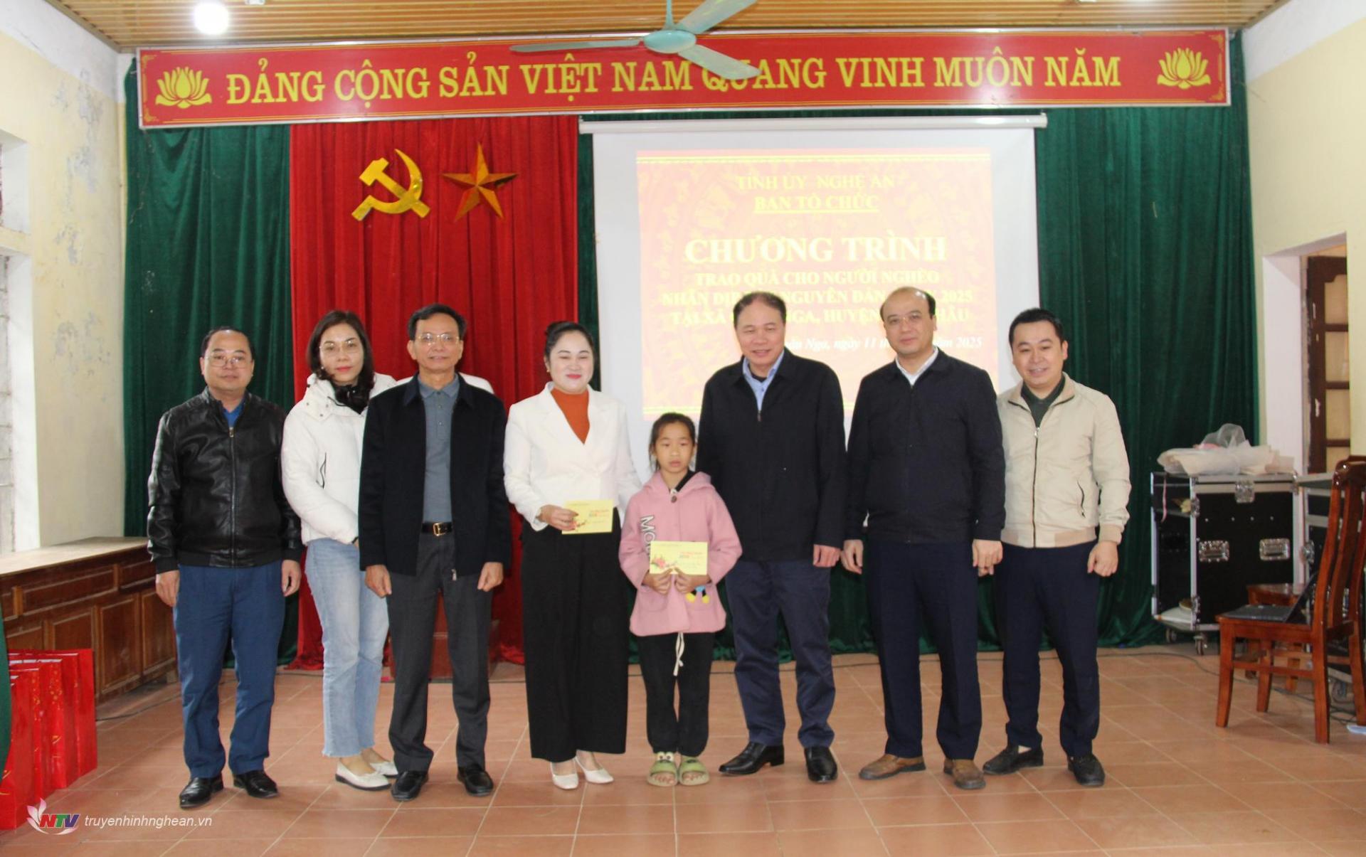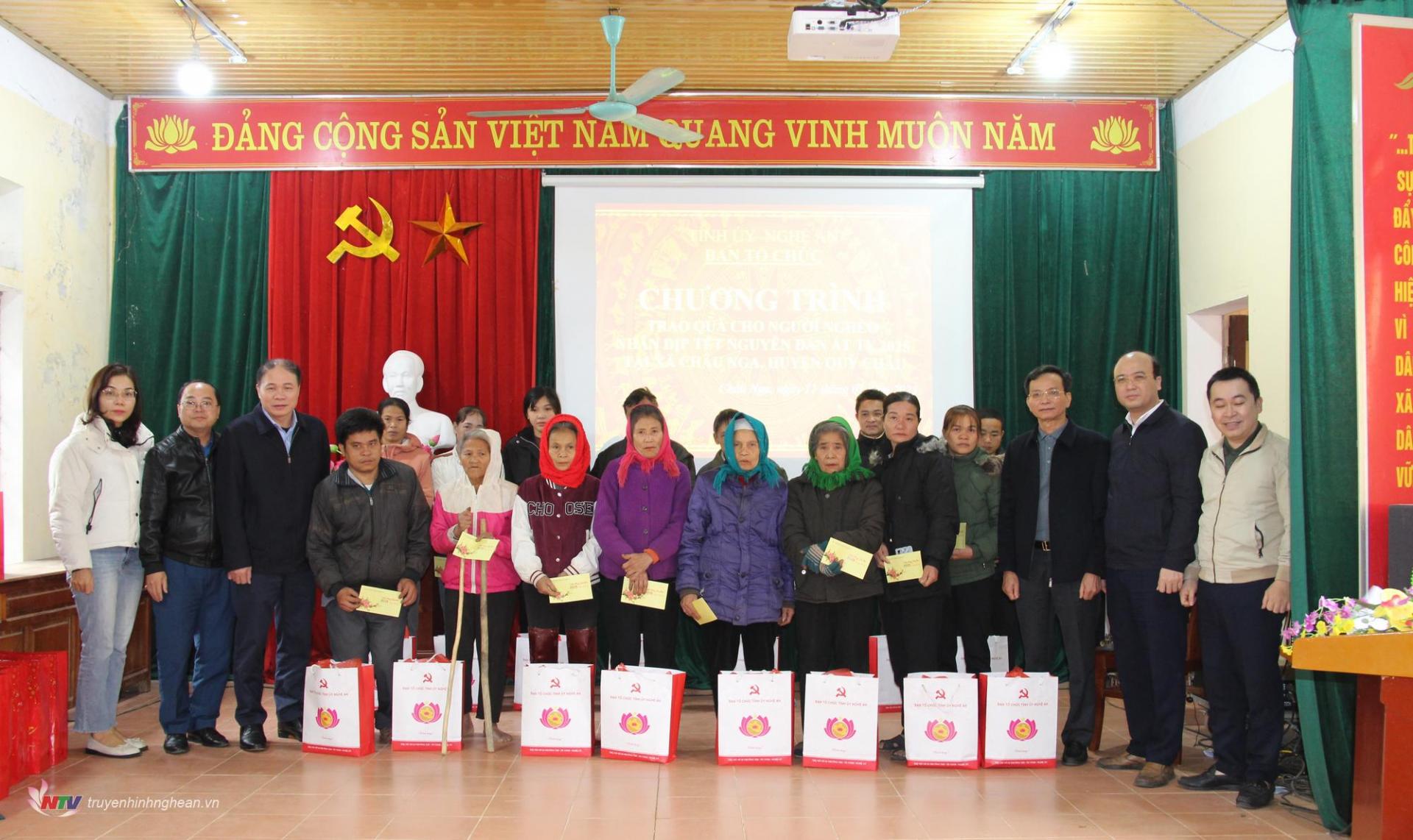 Tại buổi trao quà, đoàn công tác đã tặng 30 suất quà, mỗi suất trị giá 700.000 đồng, cho các hộ nghèo. Đồng thời, trao kinh phí hỗ trợ 10 triệu đồng cho em Bùi Vy Hồng Diệp, học sinh lớp 3A Trường Tiểu học xã Châu Nga, có hoàn cảnh đặc biệt khó khăn và được nhận đỡ đầu từ Công đoàn cơ quan Ban Tổ chức Tỉnh ủy. Ngoài ra, đoàn còn tặng quà cho Đảng ủy và Trường Tiểu học Châu Nga với tổng giá trị 2 triệu đồng.
