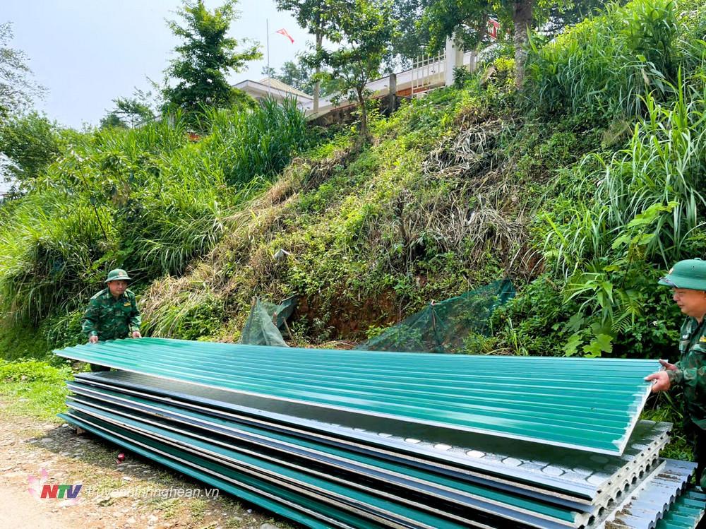 Đồn Biên phòng Nậm Càn cử cán bộ chiến sĩ hỗ trợ gia đình chị Hà Thị Quyết, cư trú tại bản Nậm Càn, xã Nậm Càn, huyện Kỳ Sơn tu sửa lại nhà, lợp lại mái nhà, dọn dẹp đồ dùng nhanh chóng ổn định cuộc sống.