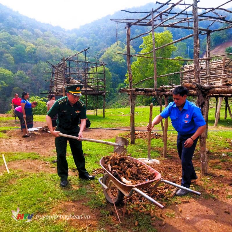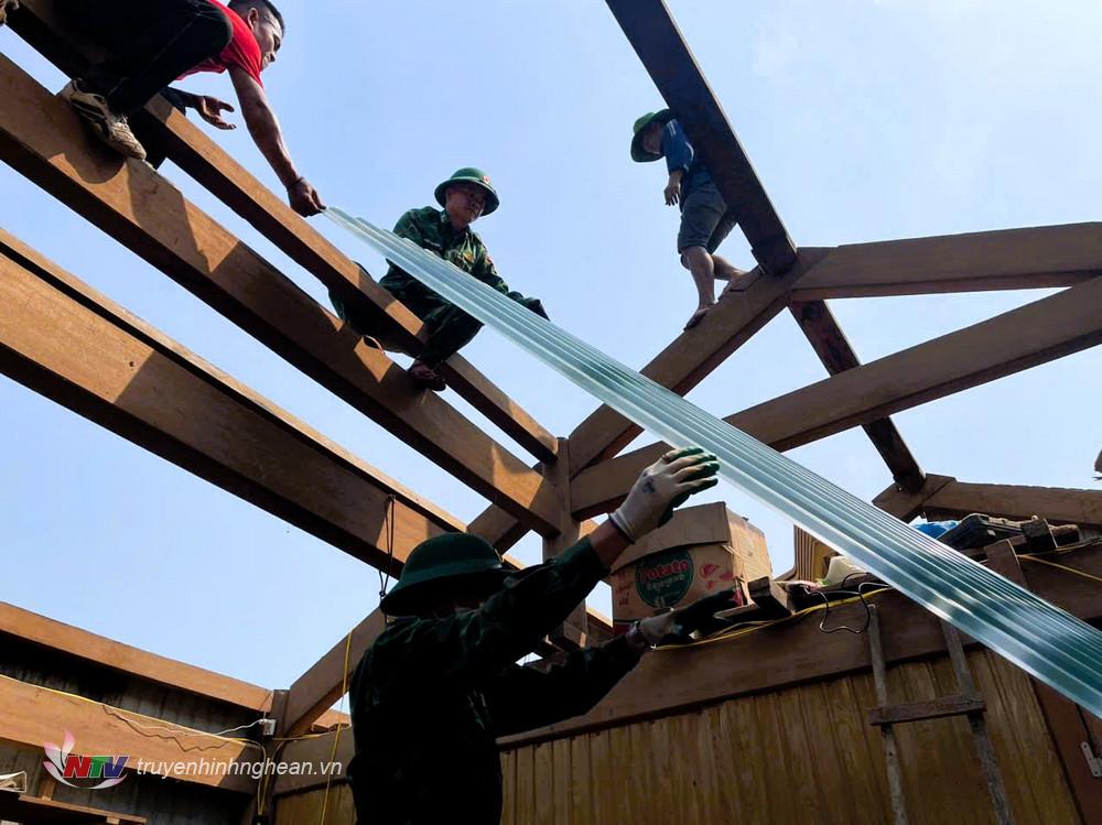 | Cán bộ chiến sĩ Đồn Biên phòng Nậm Càn hỗ trợ gia đình chị Hà Thị Quyết, cư trú tại bản Nậm Càn, xã Nậm Càn, huyện Kỳ Sơn tu sửa lại nhà ở bị hư hại do giông lốc. |