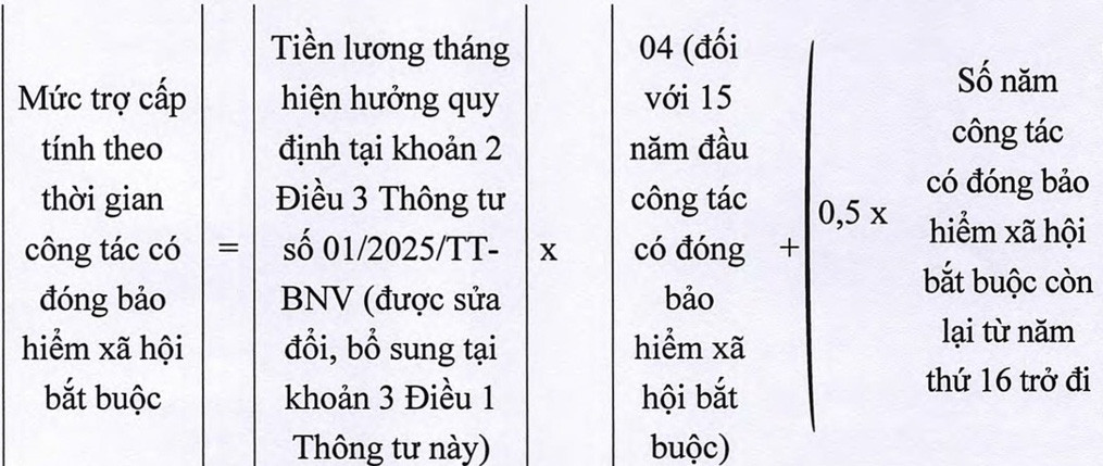 15 năm đầu công tác có đóng BHXH bắt buộc được trợ cấp 4 tháng tiền lương hiện hưởng. Đối với số năm còn lại (từ năm thứ 16 trở đi), mỗi năm được trợ cấp bằng 0,5 tháng tiền lương hiện hưởng.