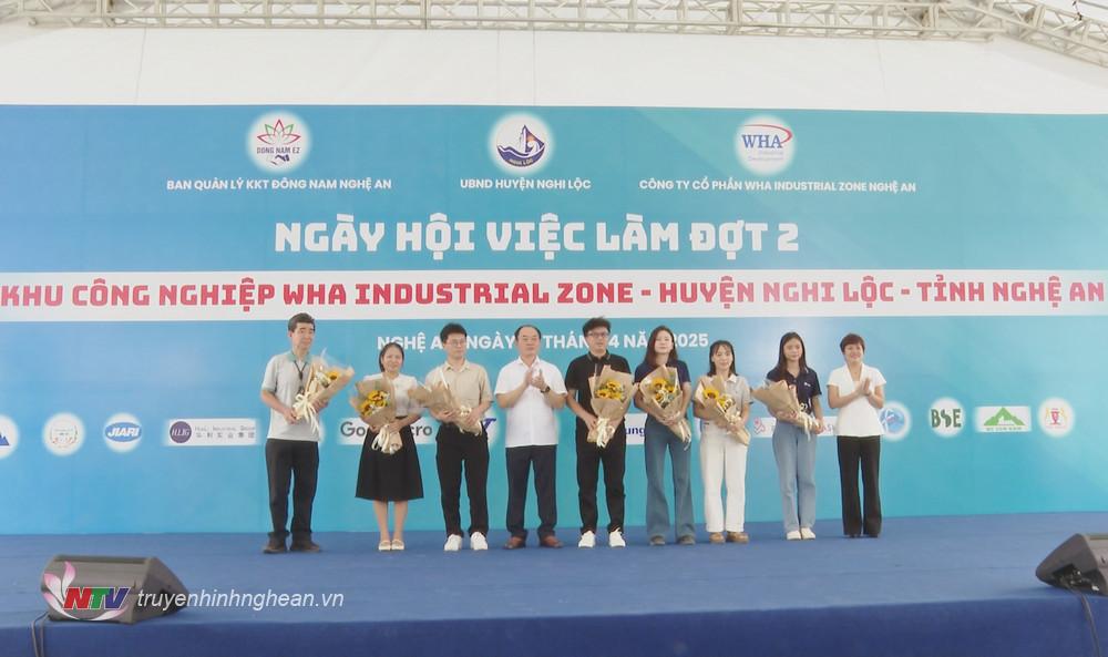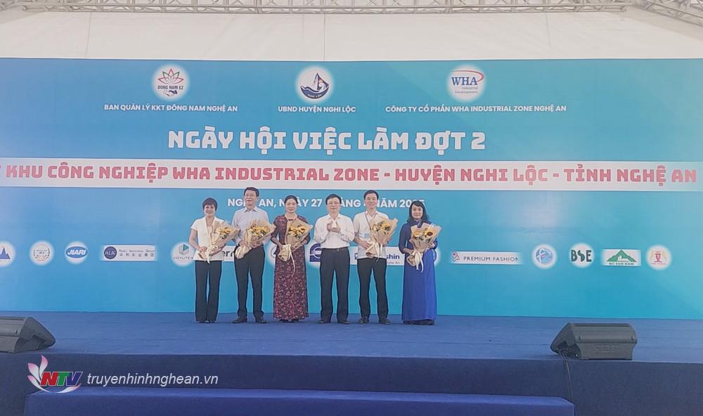| BTC tặng hoa cho các doanh nghiệp tham gia ngày hội. |