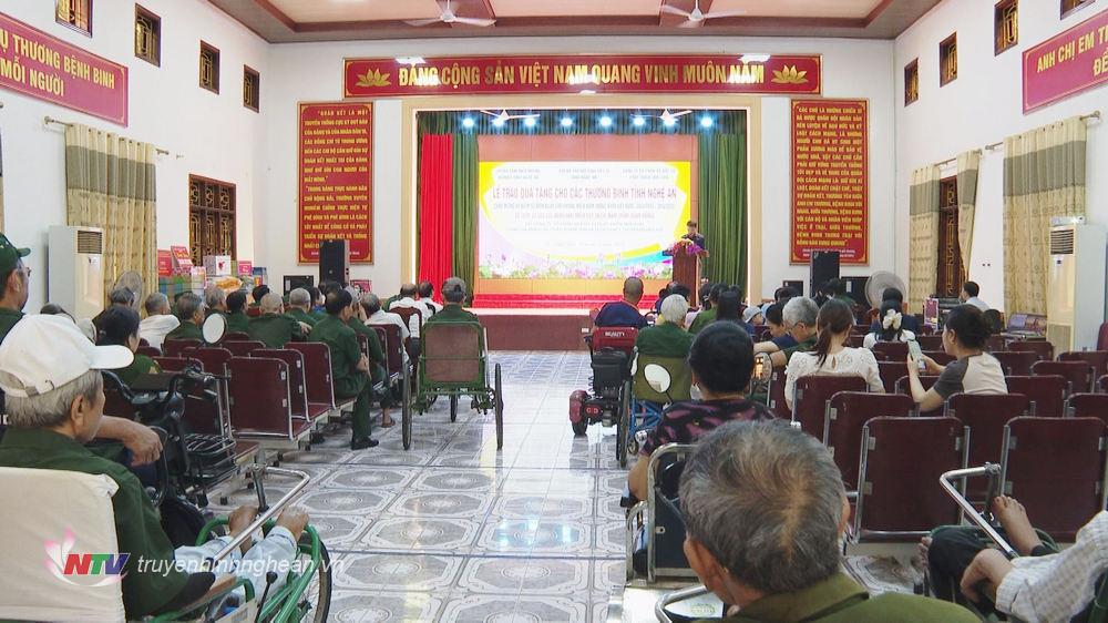 | Hội Hỗ trợ gia đình liệt sĩ và nhà tài trợ trao quà tại Khu Điều dưỡng Thương binh Tâm thần kinh Nghệ An. |