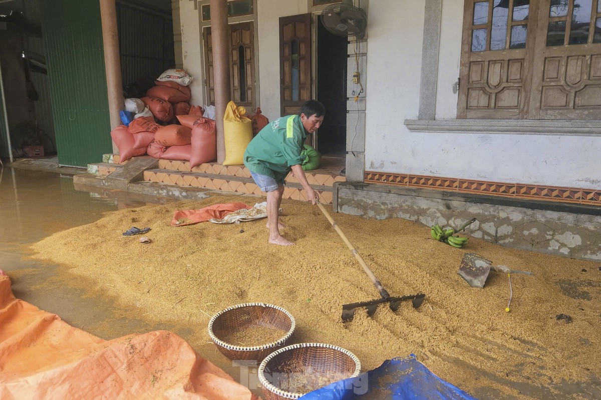 | Ghi nhận đến sáng 25/5, nước lũ ở các khu vực đang dần rút xuống, người dân tiếp tục dọn dẹp, khắc phục thiệt hại. Trong hình là gia đình ông Võ Tá Ới (trú xã Cẩm Duệ) đang dọn dẹp lại đống lúa ngập chìm sau đợt mưa lũ. |