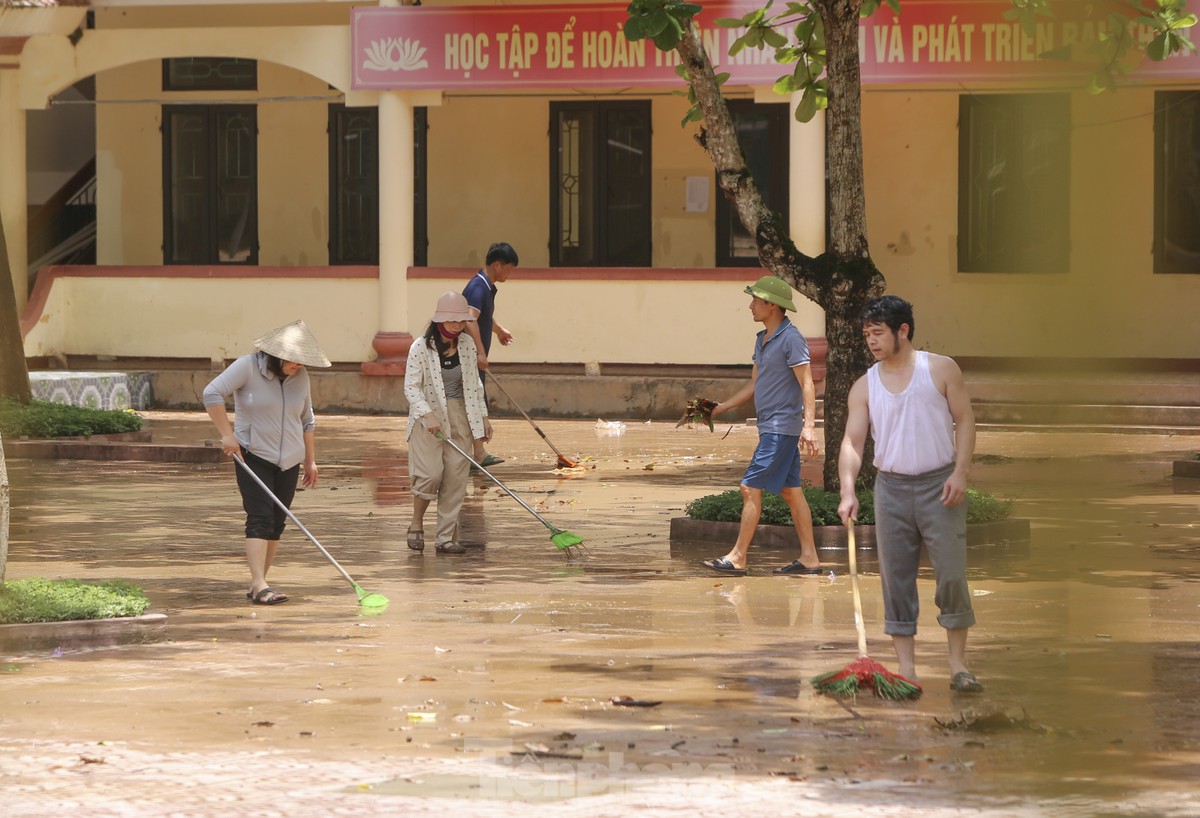 | Thầy cô giáo Trường THCS Mỹ Duệ (xã Cẩm Duệ) dọn dẹp bùn đất khi lũ rút. |
