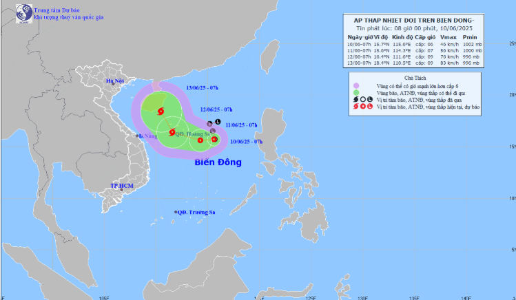 Trung tâm Dự báo khí tượng thủy văn quốc gia cho biết, vùng áp thấp trên Biển Đông đã mạnh lên thành áp thấp nhiệt đới. Hồi 7h ngày 10-6, tâm áp thấp nhiệt đới cách quần đảo Hoàng Sa khoảng 360km về phía Đông Đông Nam, sức gió vùng gần tâm áp thấp nhiệt đới mạnh cấp 6, giật cấp 8. Hiện áp thấp nhiệt đới di chuyển chậm theo hướng Tây với tốc độ khoảng 5km/h.