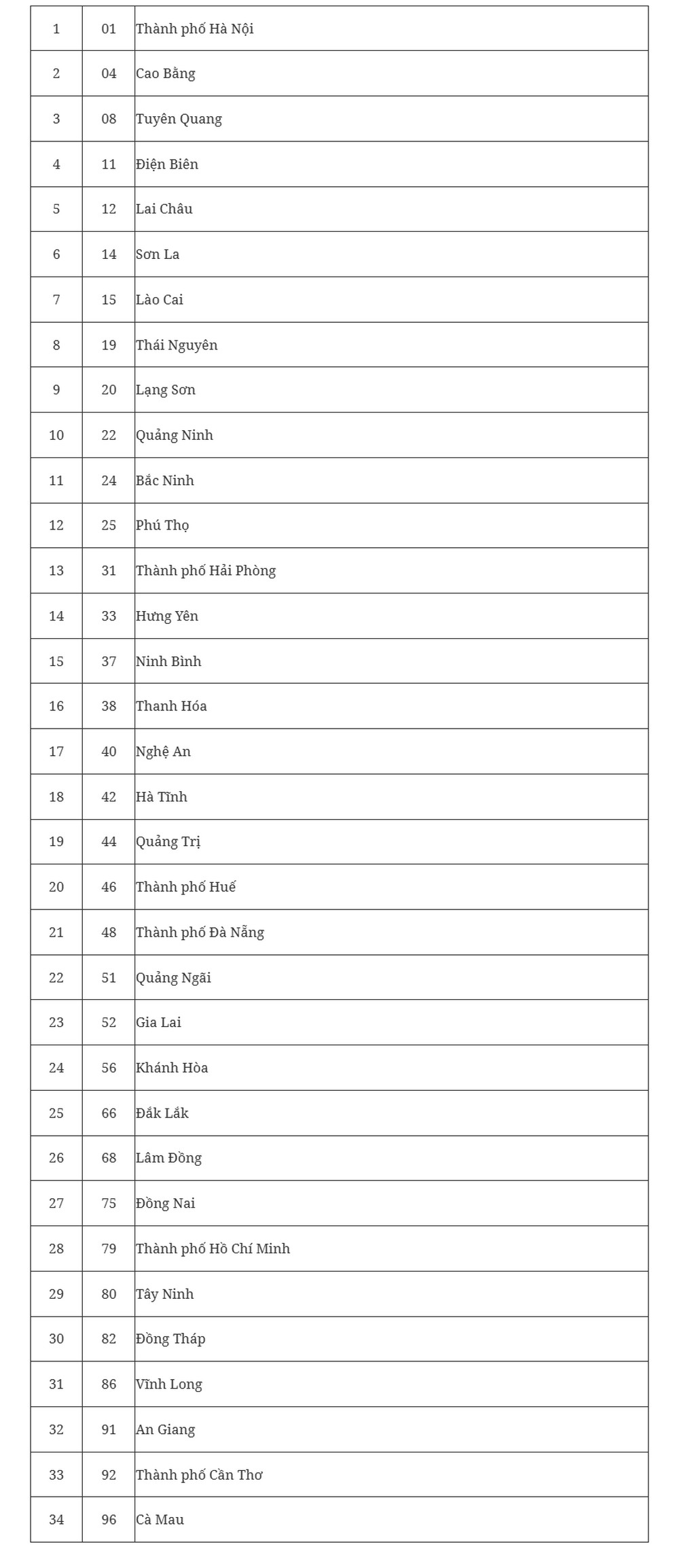 Danh mục và mã số 34 đơn vị hành chính cấp tỉnh