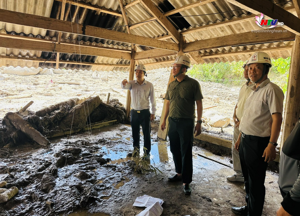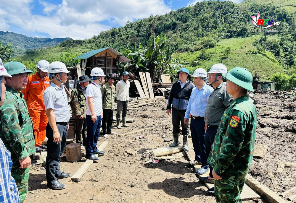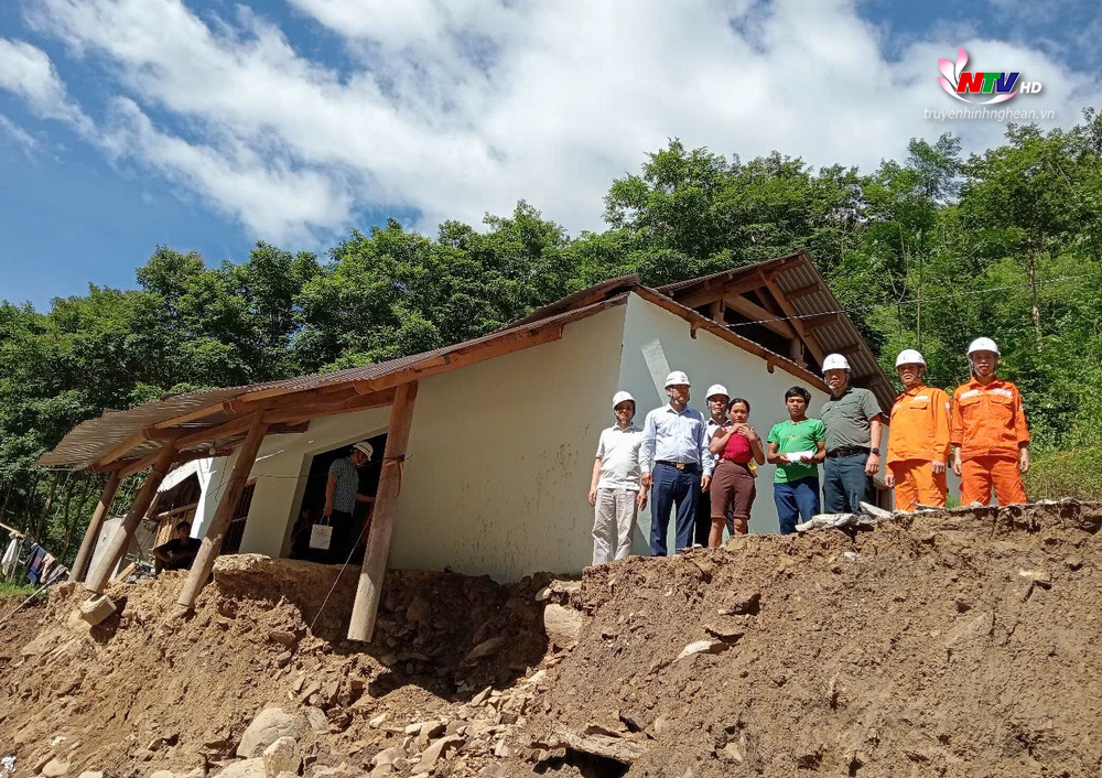 | Đoàn công tác của EVNGENCO1 và chính quyền địa phương đến thăm một hộ gia đình bị sạt lở nghiêm trọng do đợt mưa tối 29/5. |