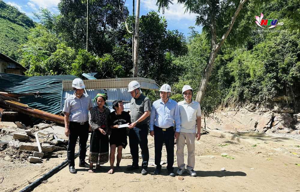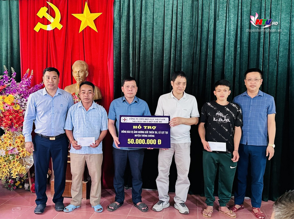 | Đại diện Nhà máy Thủy điện Khe Bố trao 50 triệu đồng hỗ trợ người dân Tương Dương khắc phục thiệt hại sau mưa lũ. |