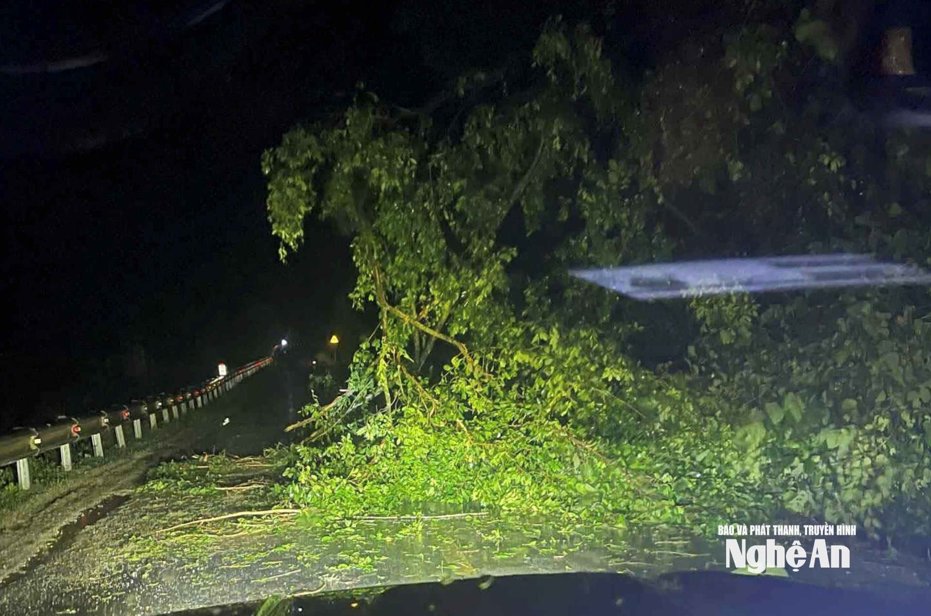 | Quốc lộ 48 đoạn qua bản Đan, xã Tiền Phong cũng xuất hiện cây gãy đổ sau mưa to, gió lớn cuối giờ chiều 19/7. Ảnh: PV |
