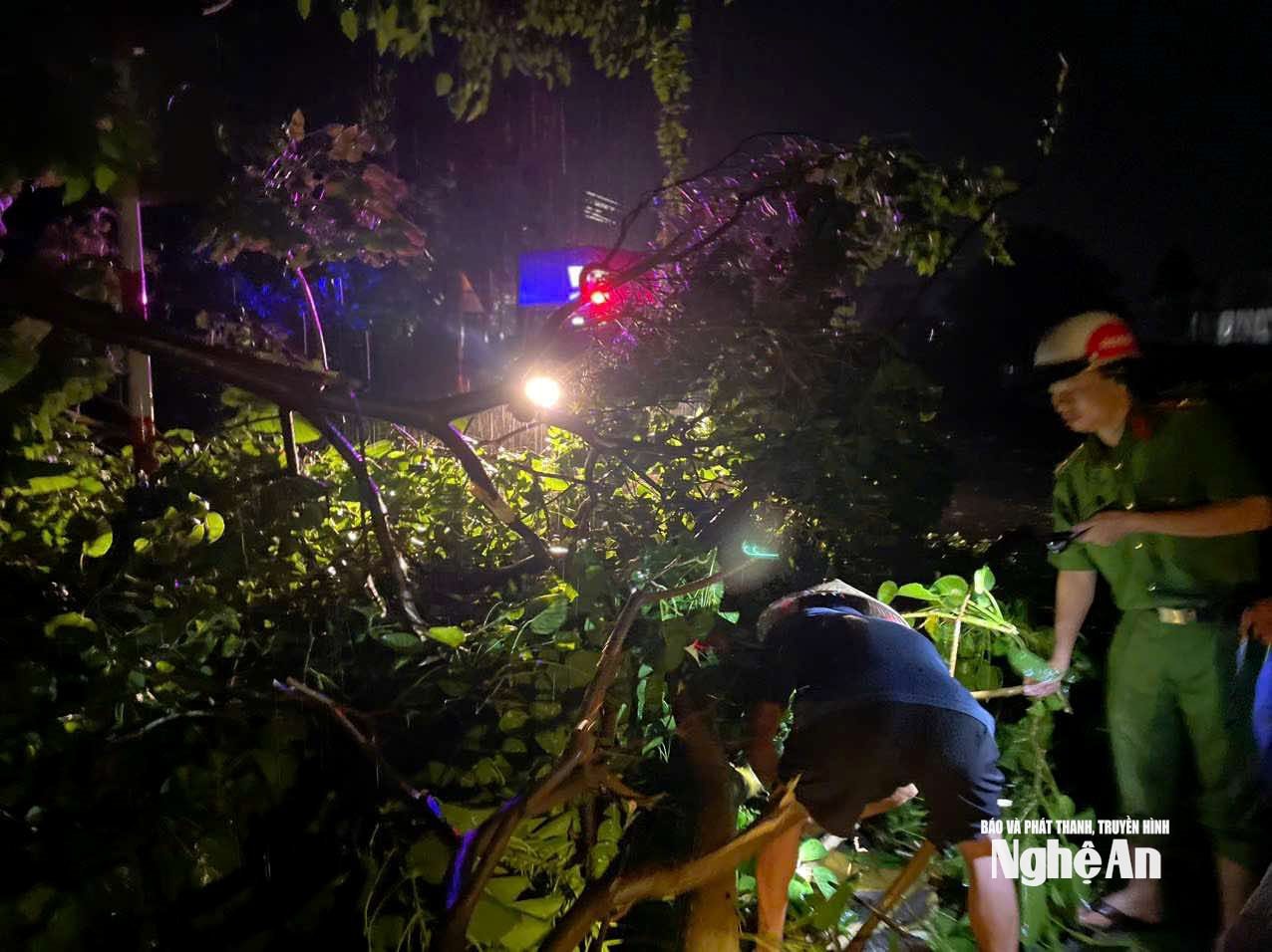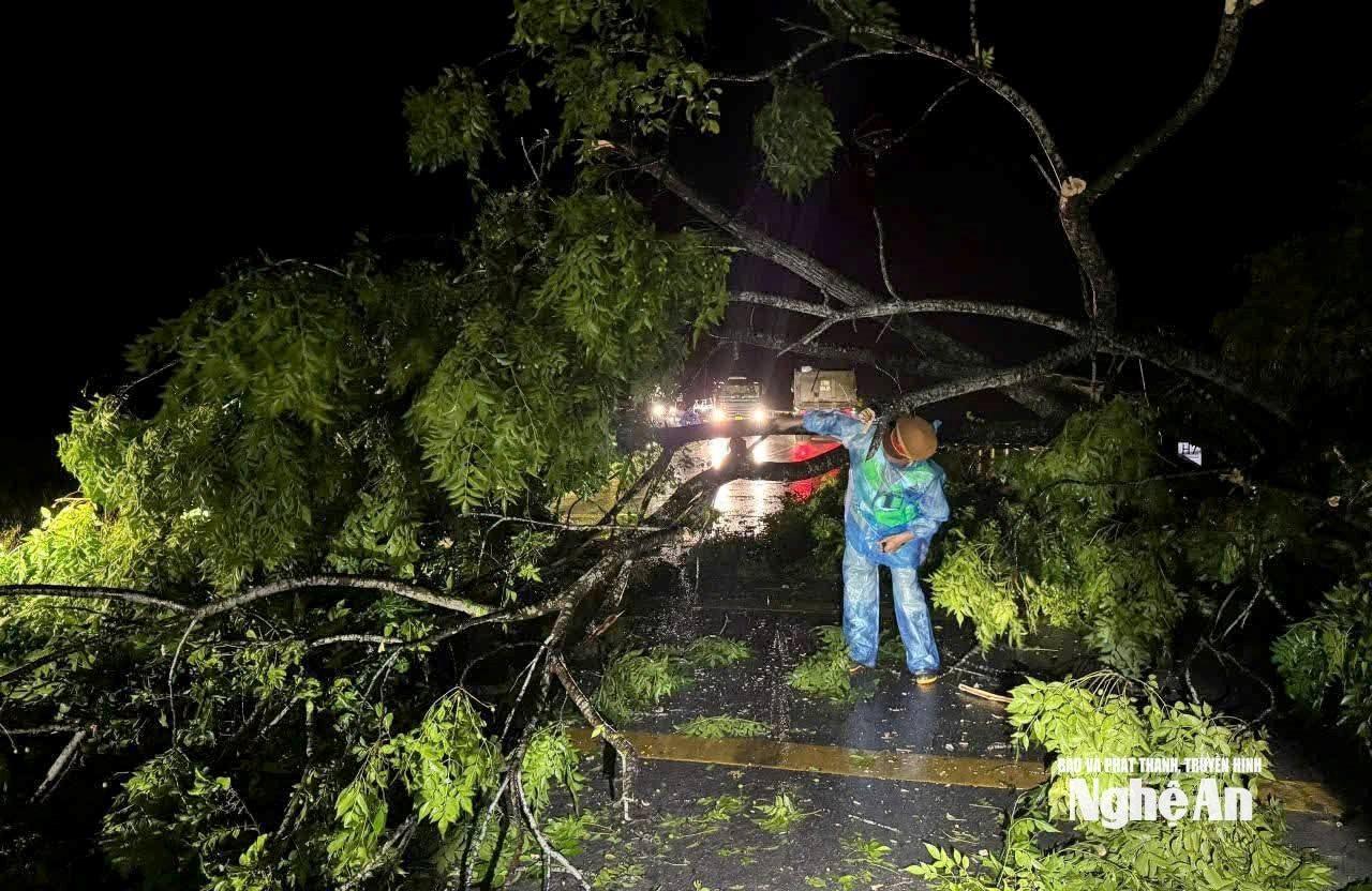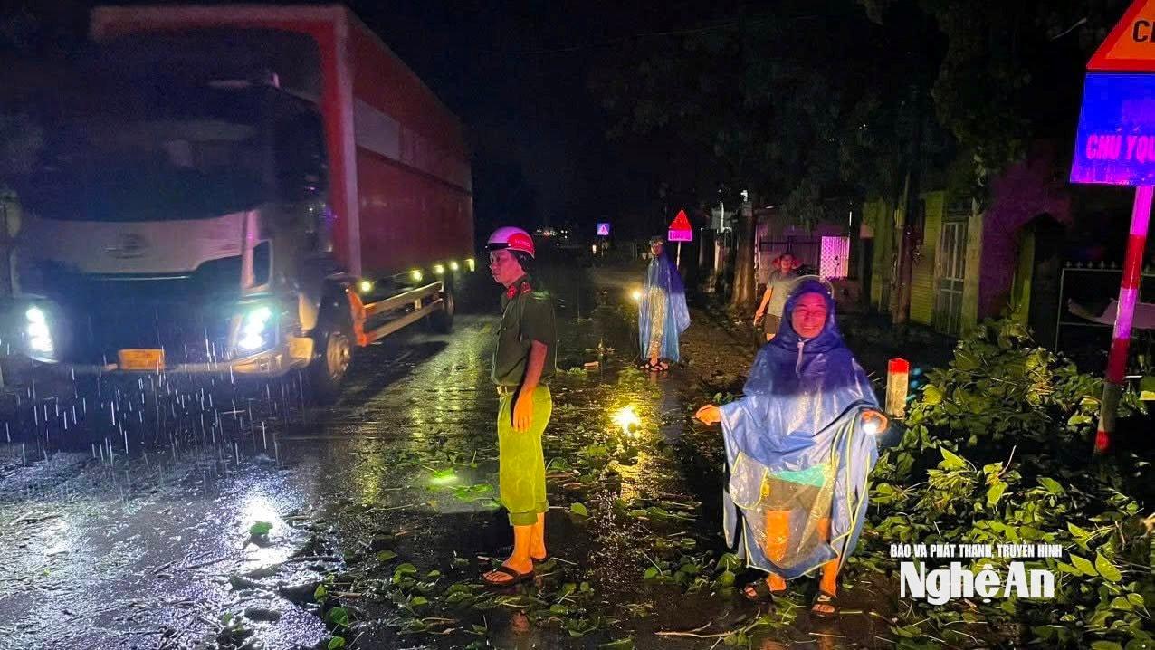 | Trên Quốc lộ 7B, đoạn qua xã Quảng Châu (thuộc xóm 6, xã Diễn Đồng cũ), nhiều cây xanh bị gãy đổ, chắn ngang đường gây ách tắc giao thông nghiêm trọng trong đêm. Ngay khi nhận được thông tin, lực lượng Công an xã Quảng Châu đã nhanh chóng có mặt tại hiện trường, phối hợp cùng cán bộ và chính quyền xã kịp thời tổ chức phân luồng, điều tiết giao thông, giải tỏa vật cản. Ảnh: P.V |