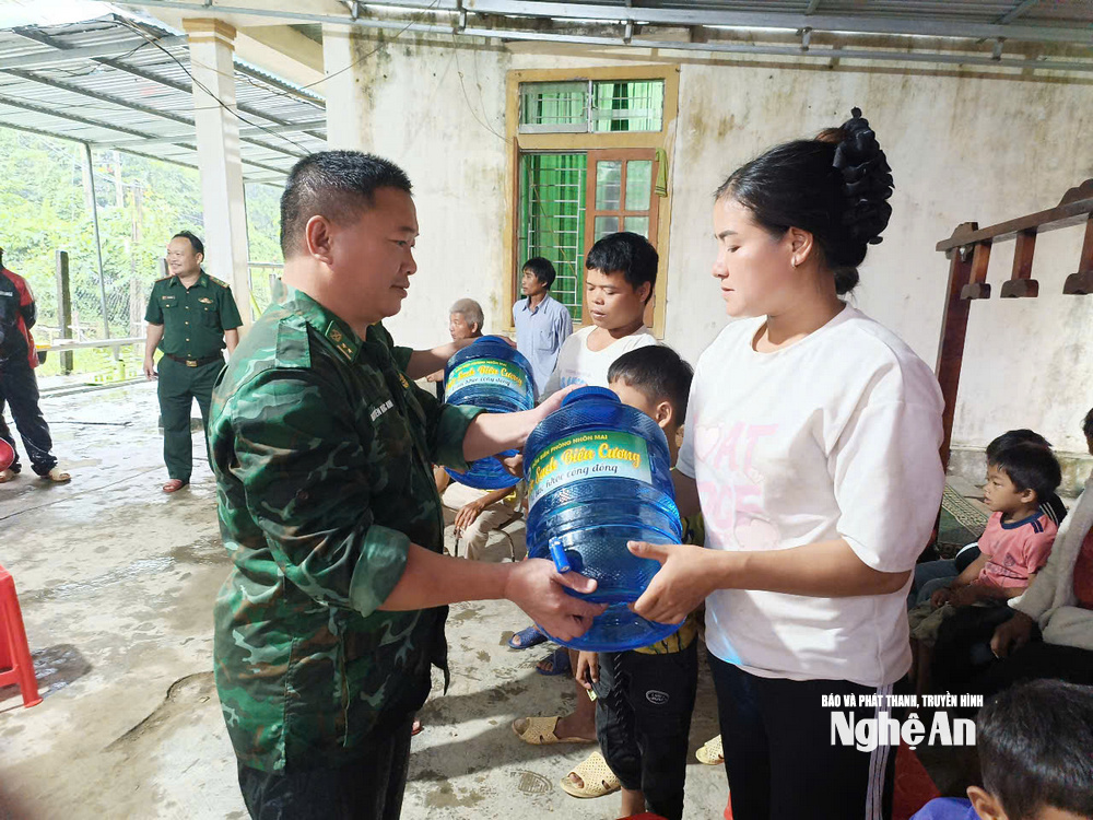 | Đồn BP Nhôn Mai trao tặng nước uống, lương thực cho các hộ dân tại địa điểm di dời. |