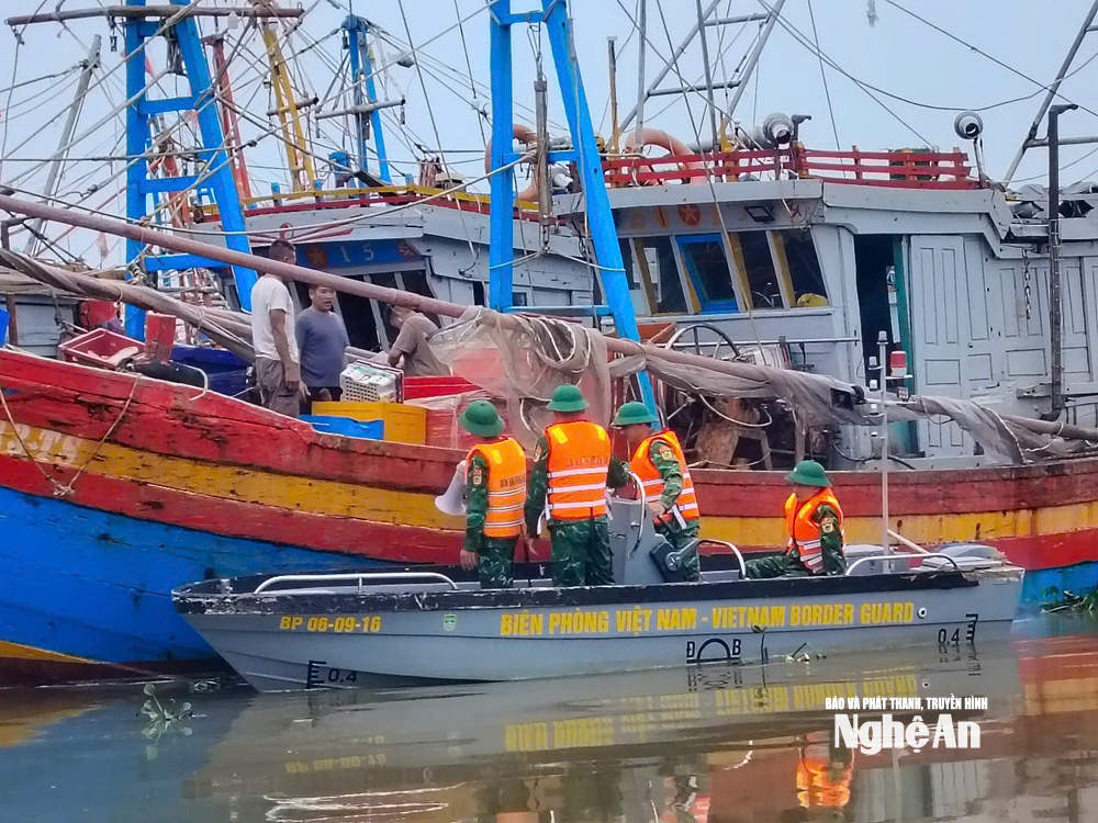| Đồn Biên phòng Diễn Thành tuyên truyền hướng dẫn các phương tiện của ngư dân neo đậu, tránh trú bão an toàn. |