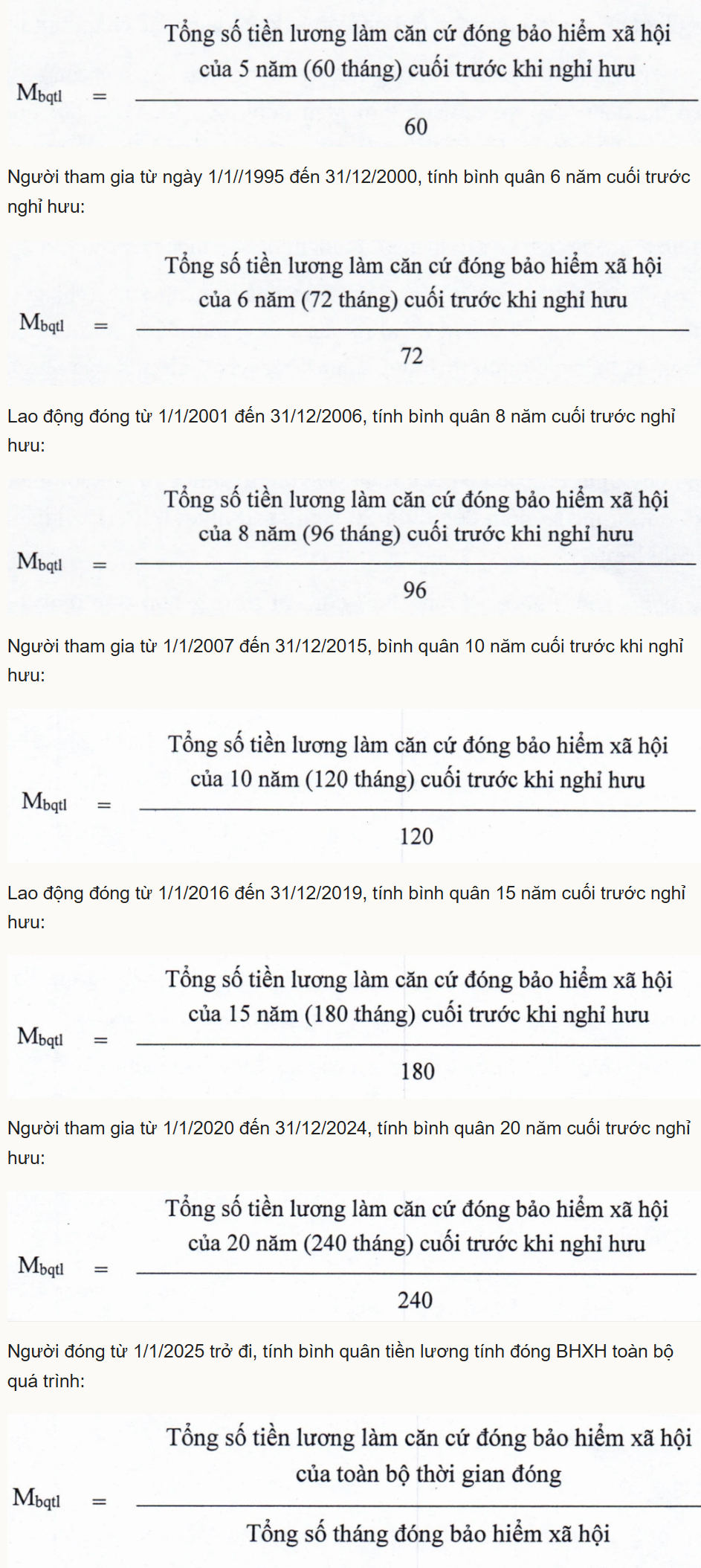 Lao động tham gia BHXH trước ngày 1/1/1995, tính bình quân 5 năm cuối trước khi nghỉ hưu. Trong đó, Mbqtl là mức bình quân tiền lương làm căn cứ đóng BHXH. Công thức tính:
