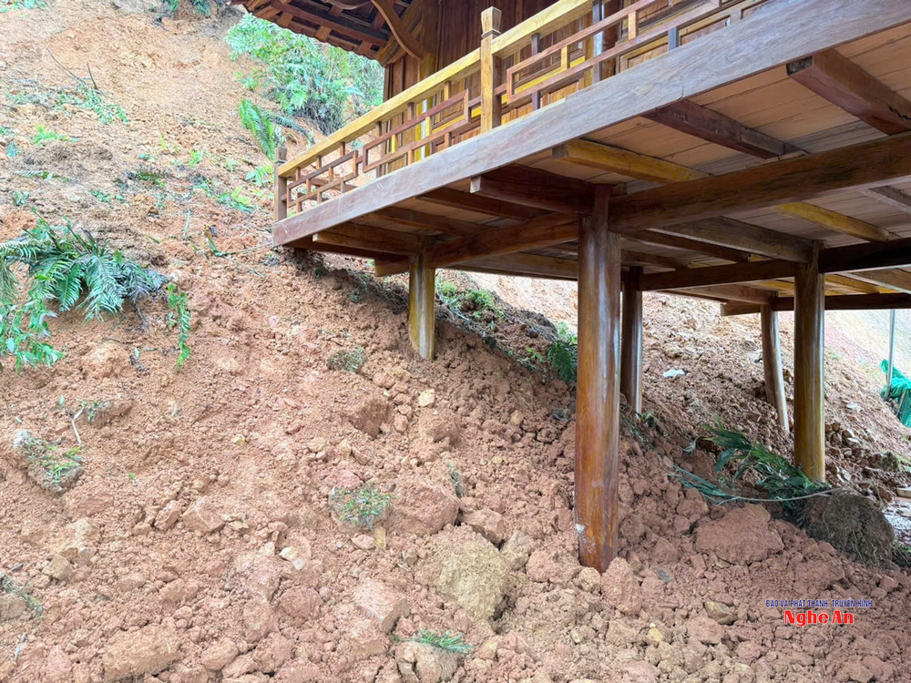 | Sạt lở khiến đất đổ xuống nhà của hộ ông Cụt Văn Đình, bản Đồn Boọng, xã Na Loi. |