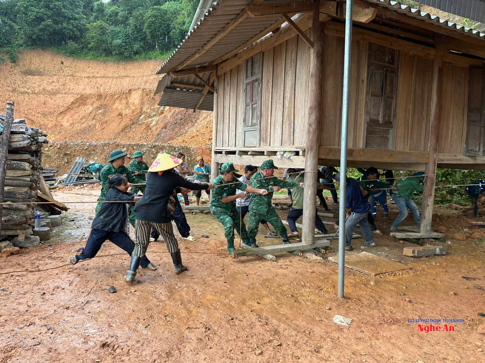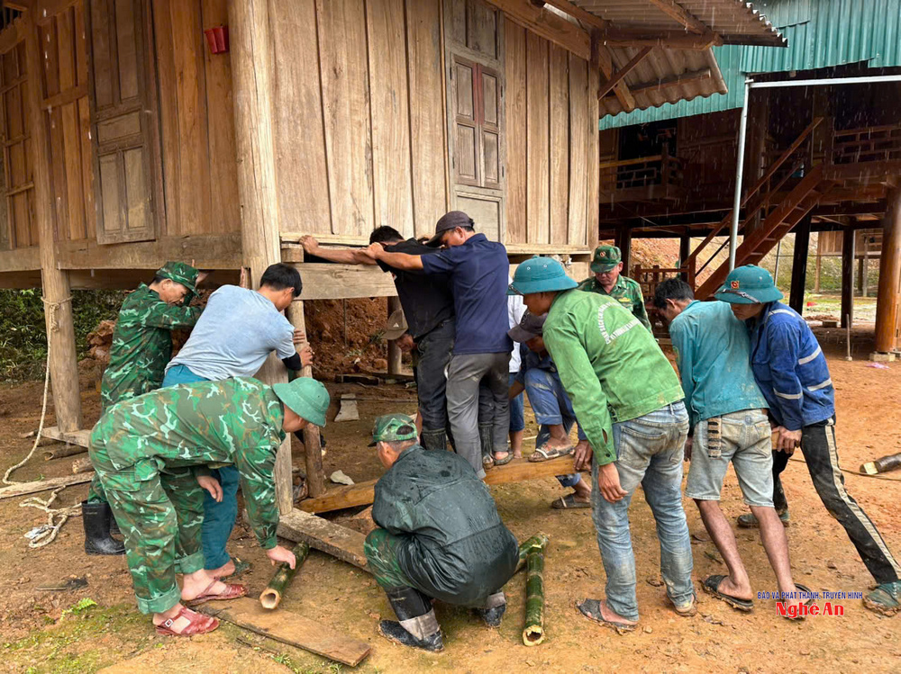 | Cán bộ, chiến sĩ Đồn biên phòng Na Loi hỗ trợ người dân khắc phục hậu quả do mưa lũ. |