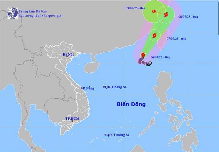 Dự báo trong 24 giờ tiếp theo, bão di chuyển theo hướng Bắc Đông Bắc với tốc độ 15–20 km/giờ và có khả năng mạnh thêm. Đến 4 giờ ngày 7/7, vị trí tâm bão được xác định ở khoảng 24,4 độ Vĩ Bắc; 119,7 độ Kinh Đông, nằm trên vùng biển tỉnh Phúc Kiến (Trung Quốc), với sức gió mạnh cấp 10–11, giật cấp 13. Vùng nguy hiểm được xác định là phía Bắc vĩ tuyến 19,5 độ Vĩ Bắc; phía Đông kinh tuyến 116,5 độ Kinh Đông. Cấp độ rủi ro thiên tai cấp 3 áp dụng cho khu vực Đông Bắc Biển Đông.