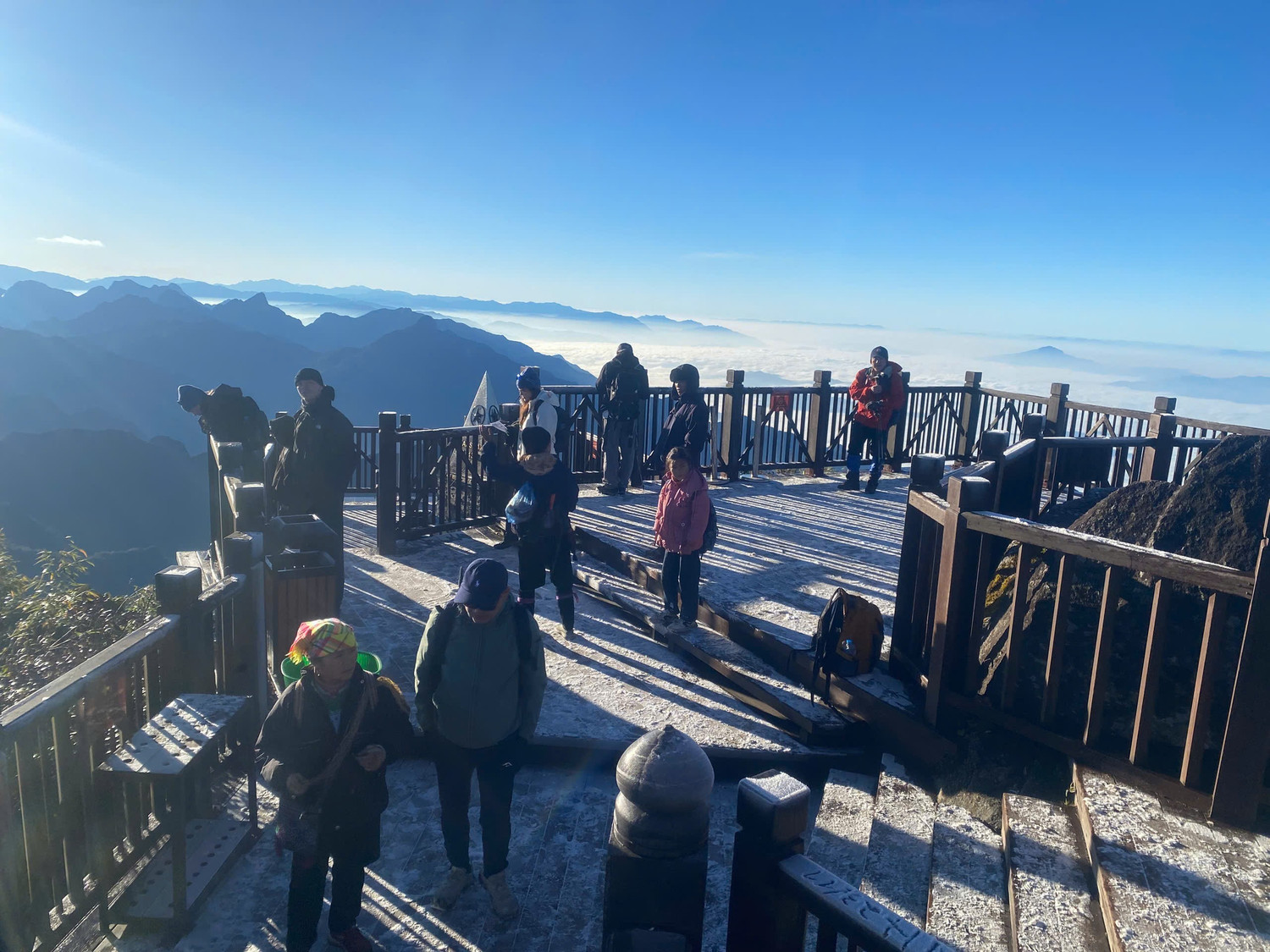 Khoảng hơn 5 giờ sáng 23/11, nhiệt độ trên đỉnh Fansipan giảm xuống khoảng -3°C. Hơi nước ngưng kết thành những mảng băng mỏng bám trên lan can, sàn gỗ và các khối đá quanh khu vực chóp tháp.