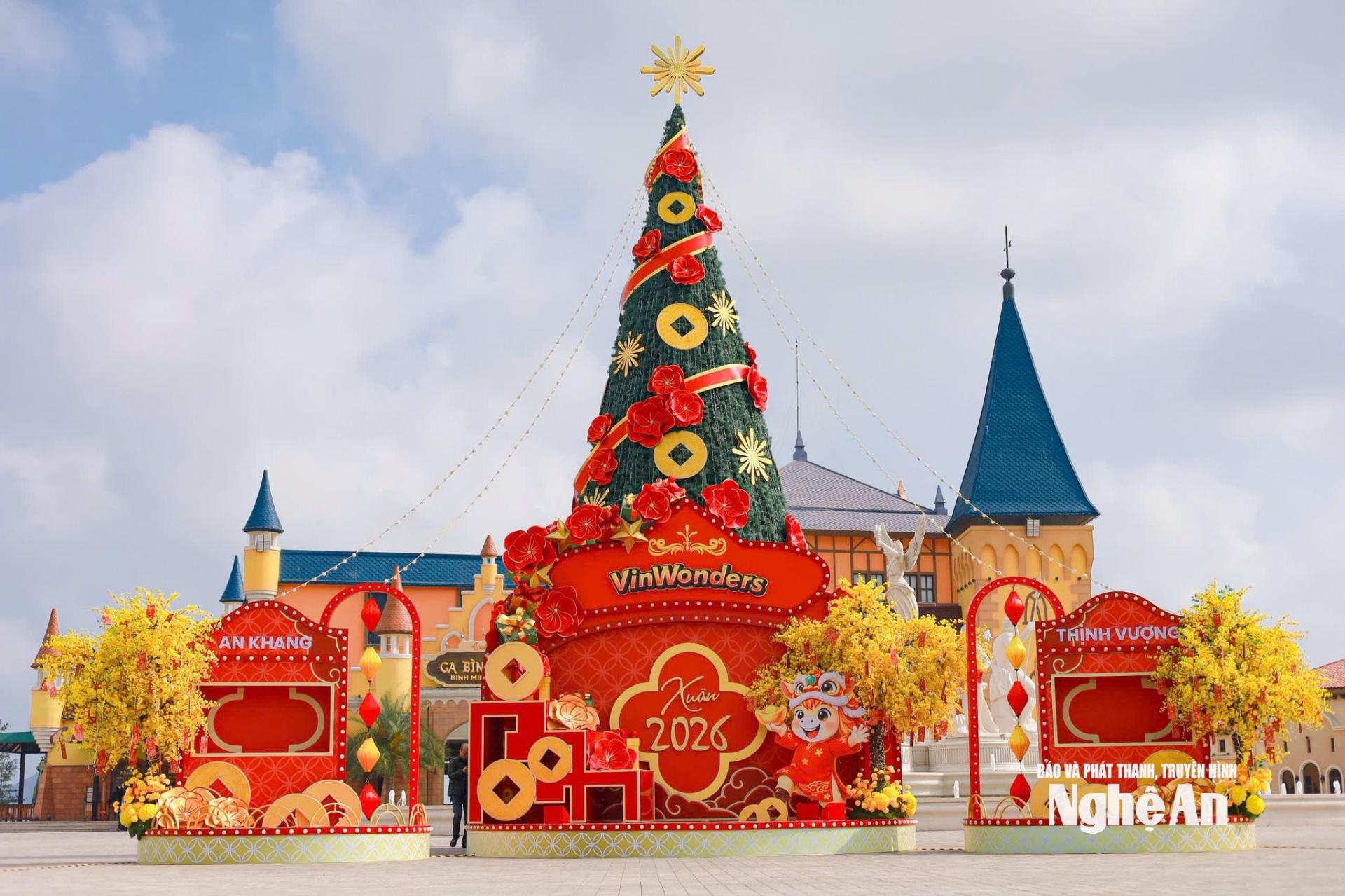 Tại Khu giải trí VinWonders Cửa Hội, không gian đón Tết được đầu tư trang trí quy mô, rực rỡ và giàu sắc xuân, trở thành điểm nhấn nổi bật tại đô thị du lịch biển phường Cửa Lò trong những ngày đầu năm. Khu vực quảng trường trung tâm được trang hoàng rực rỡ với đại cảnh trang trí Tết mang tông đỏ – vàng chủ đạo, nổi bật là mô hình cây xuân khổng lồ được trang hoàng bằng hoa mai, hoa đào cách điệu, họa tiết đồng tiền, hoa văn dân gian và biểu tượng linh vật năm mới, gợi không khí phồn vinh, may mắn.