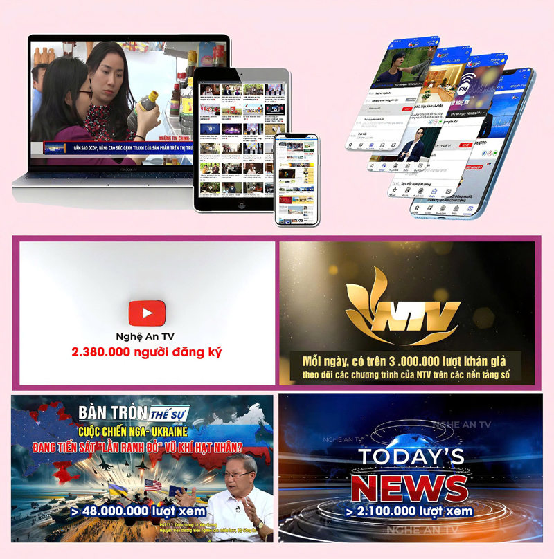 NTV hiện đang sở hữu một hệ sinh thái số phát triển mạnh mẽ với độ phủ ấn tượng trên các nền tảng. Kênh YouTube Nghệ An TV hiện có 2,38 triệu người đăng ký, mỗi ngày thu hút trên 3 triệu lượt xem, với nhiều chương trình nổi bật như “Bàn tròn thế sự” đạt hơn 48 triệu lượt xem, có nhiều video vượt mốc 1 triệu lượt xem; Bản tin “Today’s News” được sản xuất hằng ngày cũng thu hút hơn 2,1 triệu lượt xem, với nhiều video vượt mốc 20 ngàn lượt xem ngay khi vừa phát hành. Trên Fanpage Truyền hình Nghệ An thu hút hơn 570 ngàn người theo dõi, đạt hơn 40 triệu lượt xem mỗi tháng và gần 1 triệu lượt tương tác. Bên cạnh đó, ứng dụng NTVgo cũng ghi nhận hơn 42 ngàn lượt cài đặt, với hàng chục ngàn lượt xem video và đọc bài viết mỗi tháng.