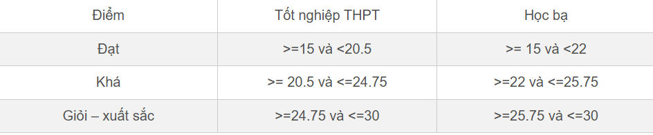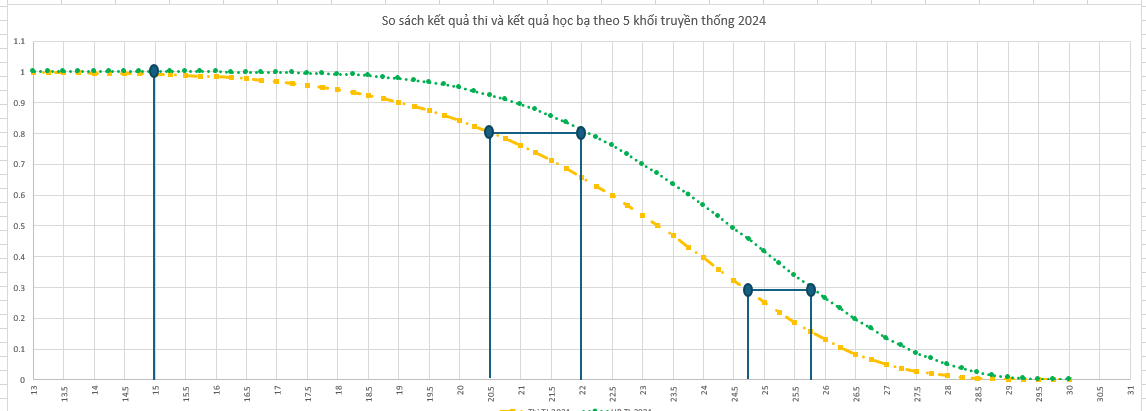 Ví dụ: Phân tích kết quả của cùng một nhóm thí sinh sử dụng kết quả thi tốt nghiệp THPT năm 2024 và kết quả học bạ (6 học kỳ) theo 5 khối truyền thống; căn cứ đánh giá kết quả học tập của sinh viên các năm trước cho thấy: Thí sinh giỏi - xuất sắc chiếm tỉ lệ 30% tổng số thí sinh trúng tuyển, tương ứng kết quả thi THPT là 24,75 và điểm học bạ trúng tuyển là 25,75; thí sinh khá trở lên chiếm tỉ lệ 80% tổng số thí sinh, điểm thi kết quả thi THPT trúng tuyển tương ứng là 20,5 và điểm trúng tuyển học bạ là 22,0; còn lại là mức đạt.