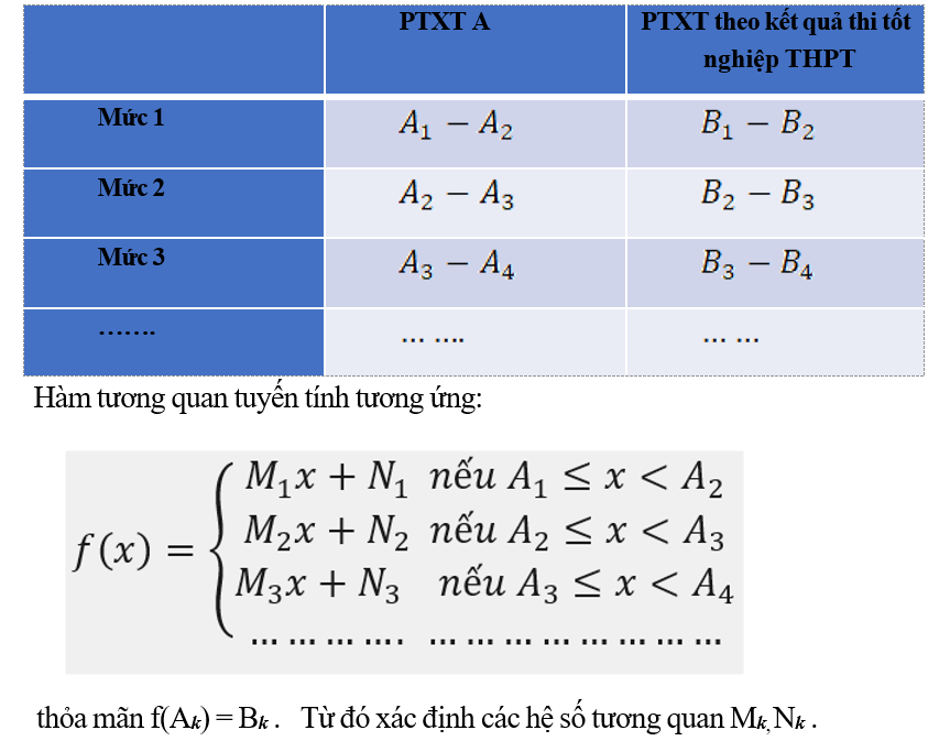 Trên cơ sở phân tích mối tương quan giữa kết quả học tập ở đại học và phổ điểm của các phương thức xét tuyển của cùng nhóm thí sinh; từ ngưỡng bảo đảm chất lượng đầu vào cho tới điểm tối đa của thang điểm xét, các trường phải xác định tối thiểu 3 vùng điểm (ví dụ: Xuất sắc - giỏi, khá và đạt) để xây dựng tối thiểu 3 hàm tương quan tuyến tính (3 hàm bậc nhất) cho 3 vùng điểm này.