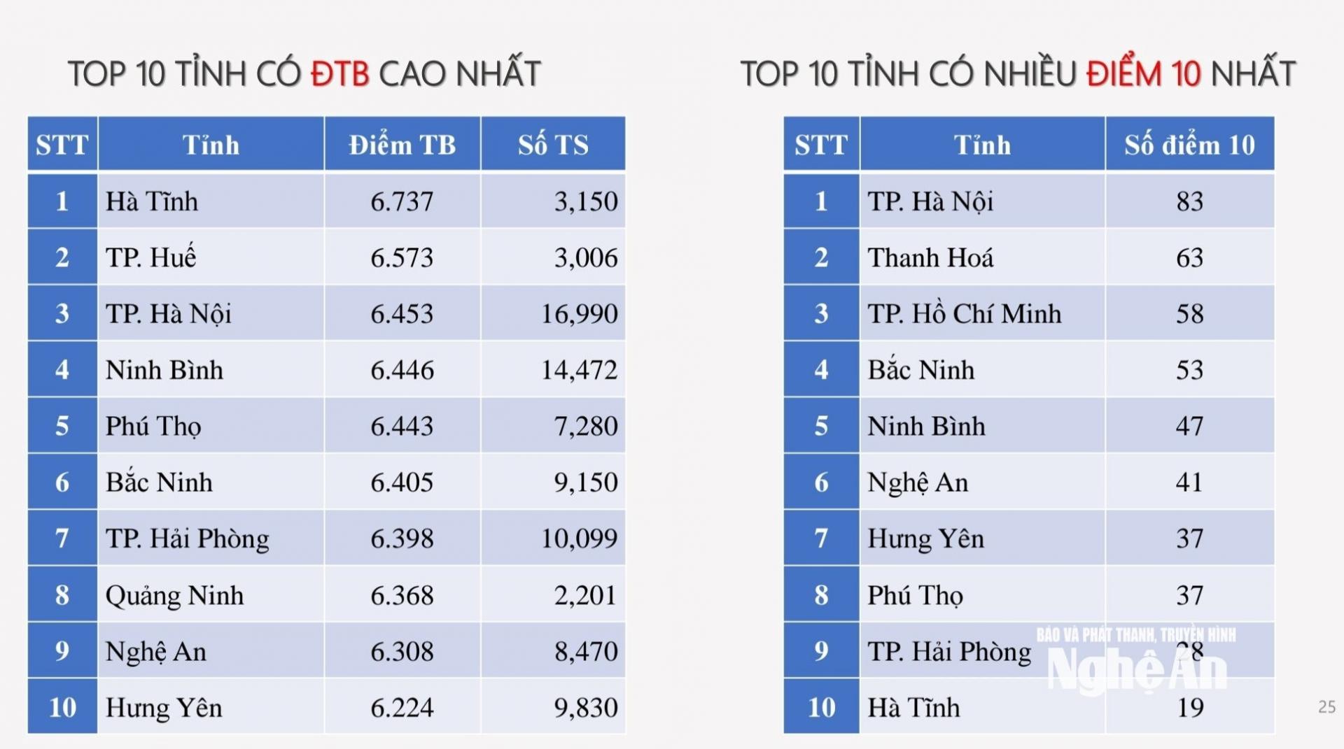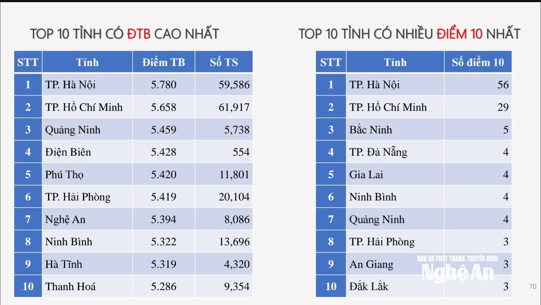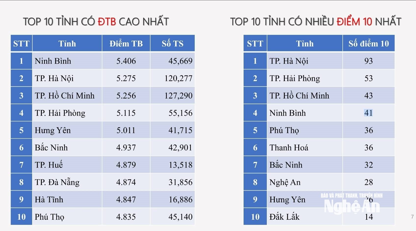 Ở môn Toán, dù không nằm trong tốp 10 về điểm trung bình nhưng Nghệ An đứng thứ 8 về tỉnh có nhiều điểm 10, với 28 em đạt điểm 10.