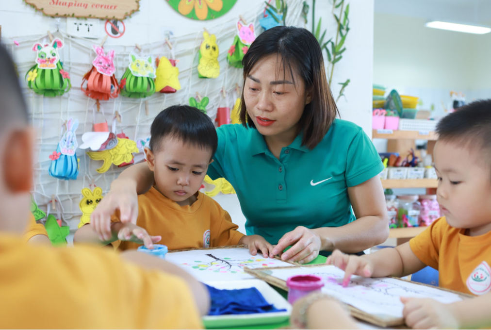 | Cô và trò Trường Mầm non An Khánh B (An Khánh, Hà Nội) trong giờ hoạt động góc. Ảnh: Đình Tuệ |