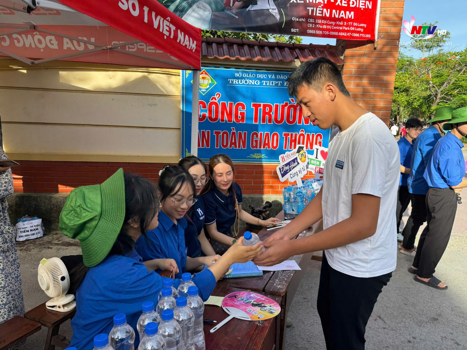 Thời tiết nóng bức, để giúp các thí sinh dự thi đạt kết quả tốt, đội thanh niên tình nguyện đã có mặt 2 bên cổng trường để hỗ trợ thí sinh. Nước uống được đặt sẵn trên bàn để phục vụ cho thí sinh.Ảnh: Ngọc Phương