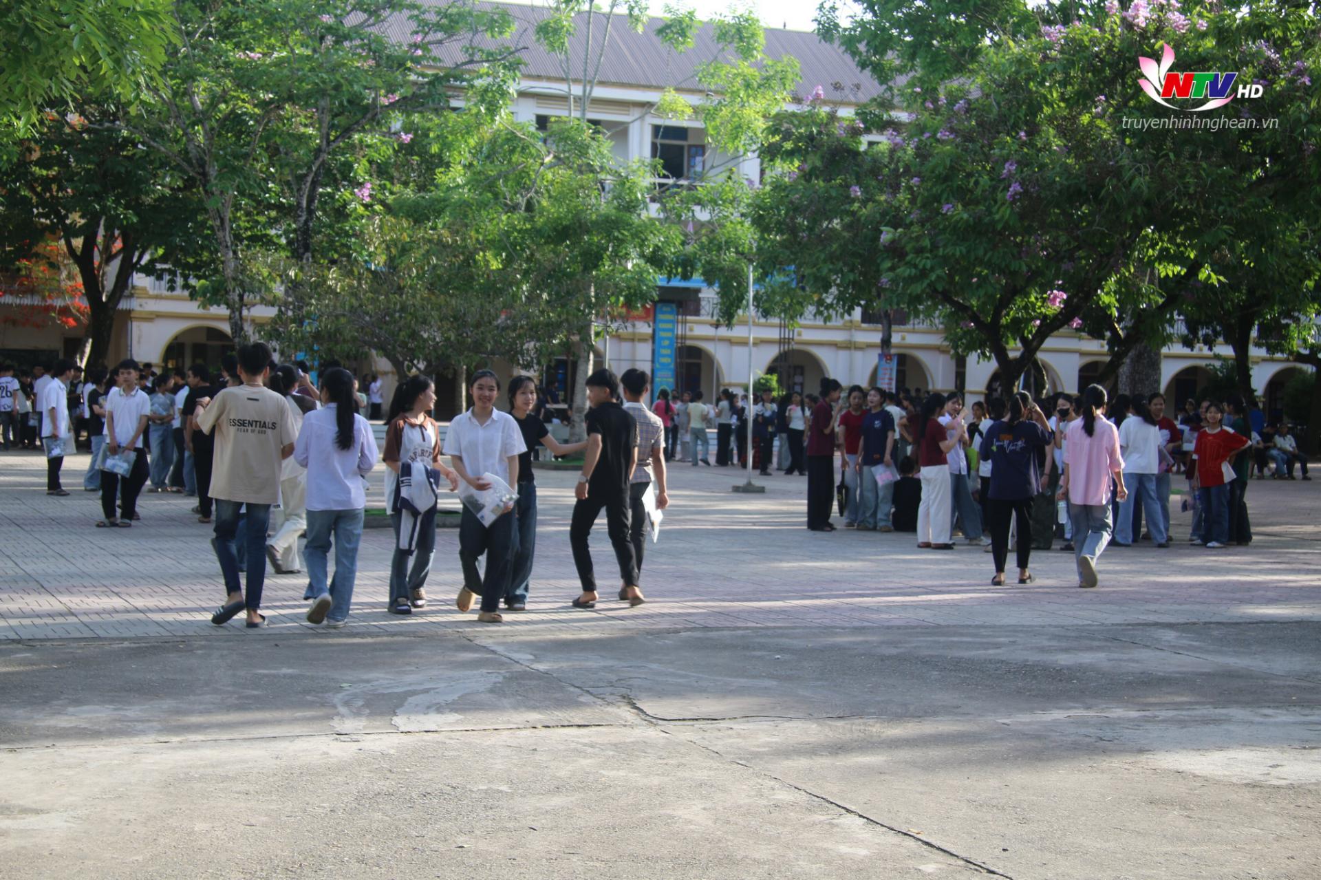 Thí sinh TX Thái Hoà trao đổi đáp án sau giờ thi môn Ngữ Văn.. Ảnh: Minh Thái.