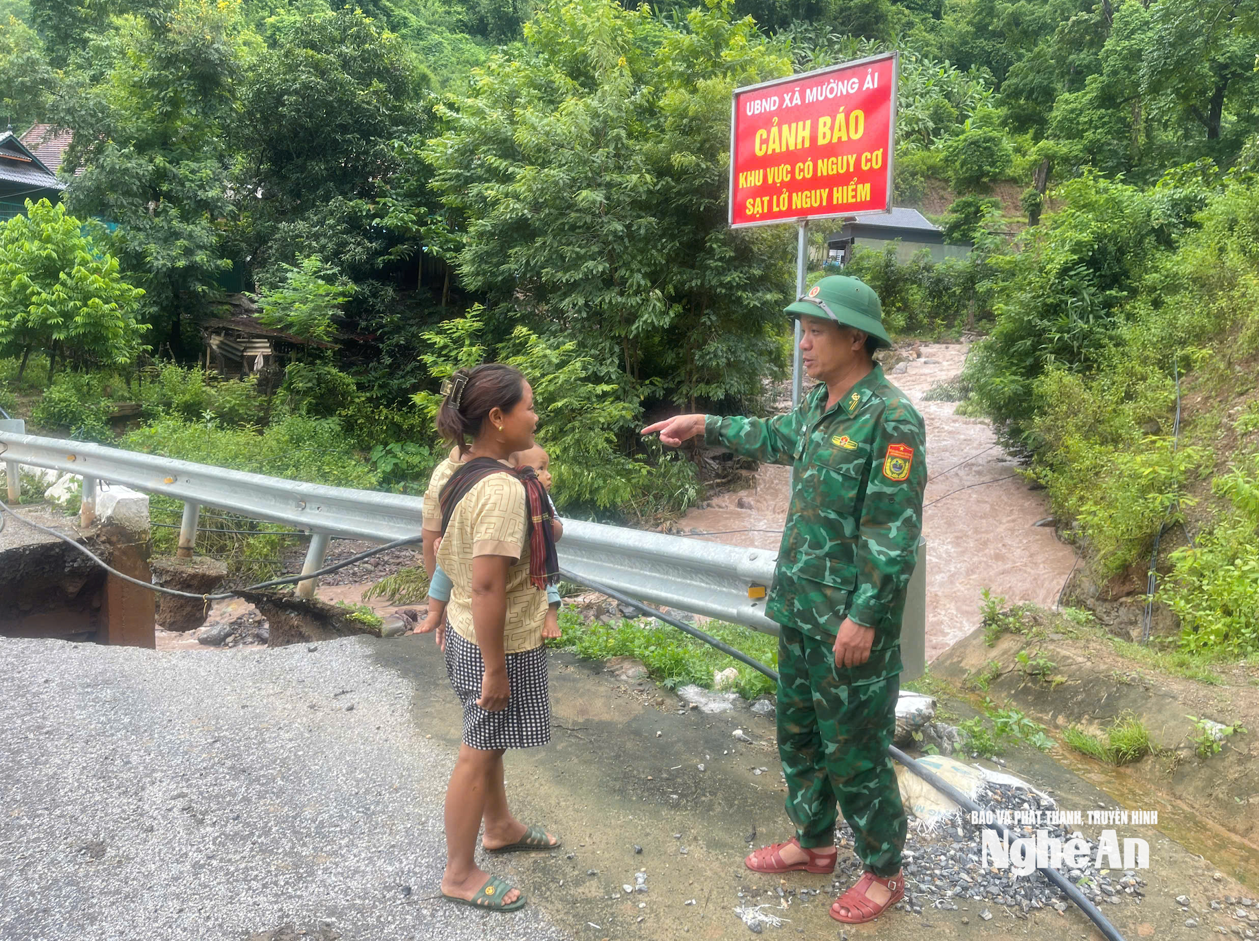 | Đoạn đường từ bản Huồi Khói (gần UBND xã Mường Típ) vào Mường Ải (cũ) bị sạt lở mái ta luy dương (khoảng 20 điểm sạt lở nặng). Phía ta luy âm nhiều đoạn bị dòng nước sông Nậm Mộ phá hết phần mặt đường, hiện tại không thể qua lại được. Ảnh CSCC |