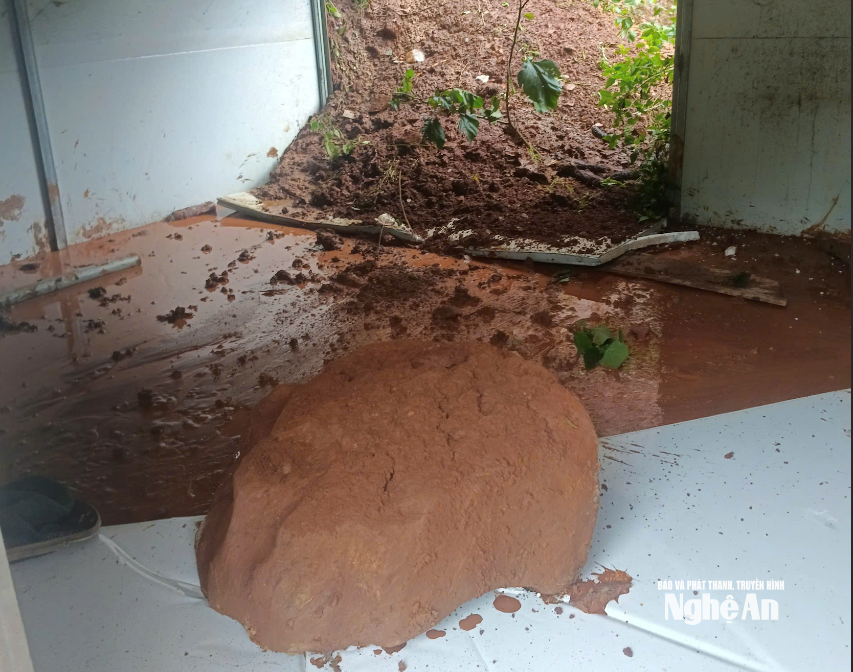 | Đất đá trên núi lăn xuống làm hư hỏng nhà dân. Ảnh CSCC |