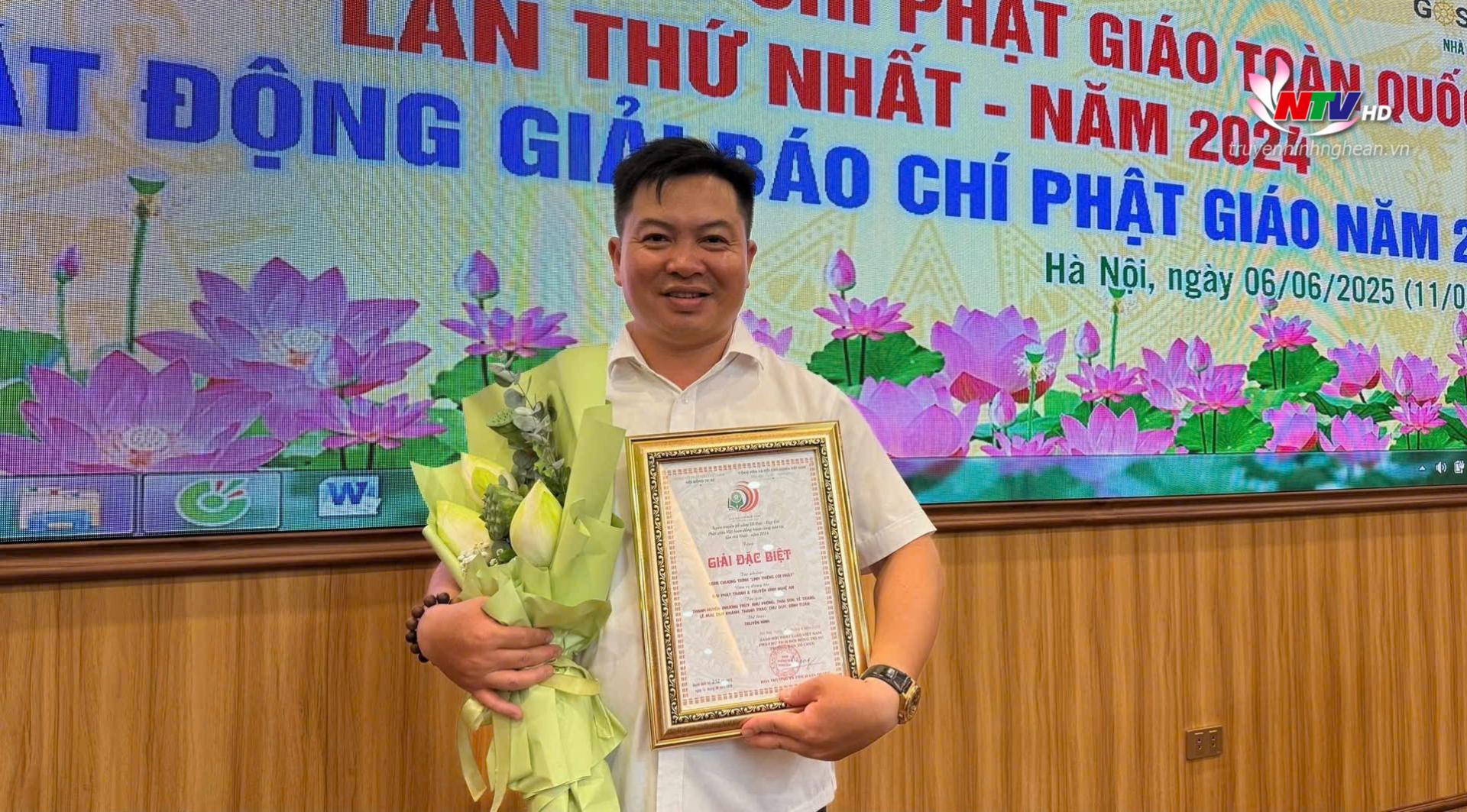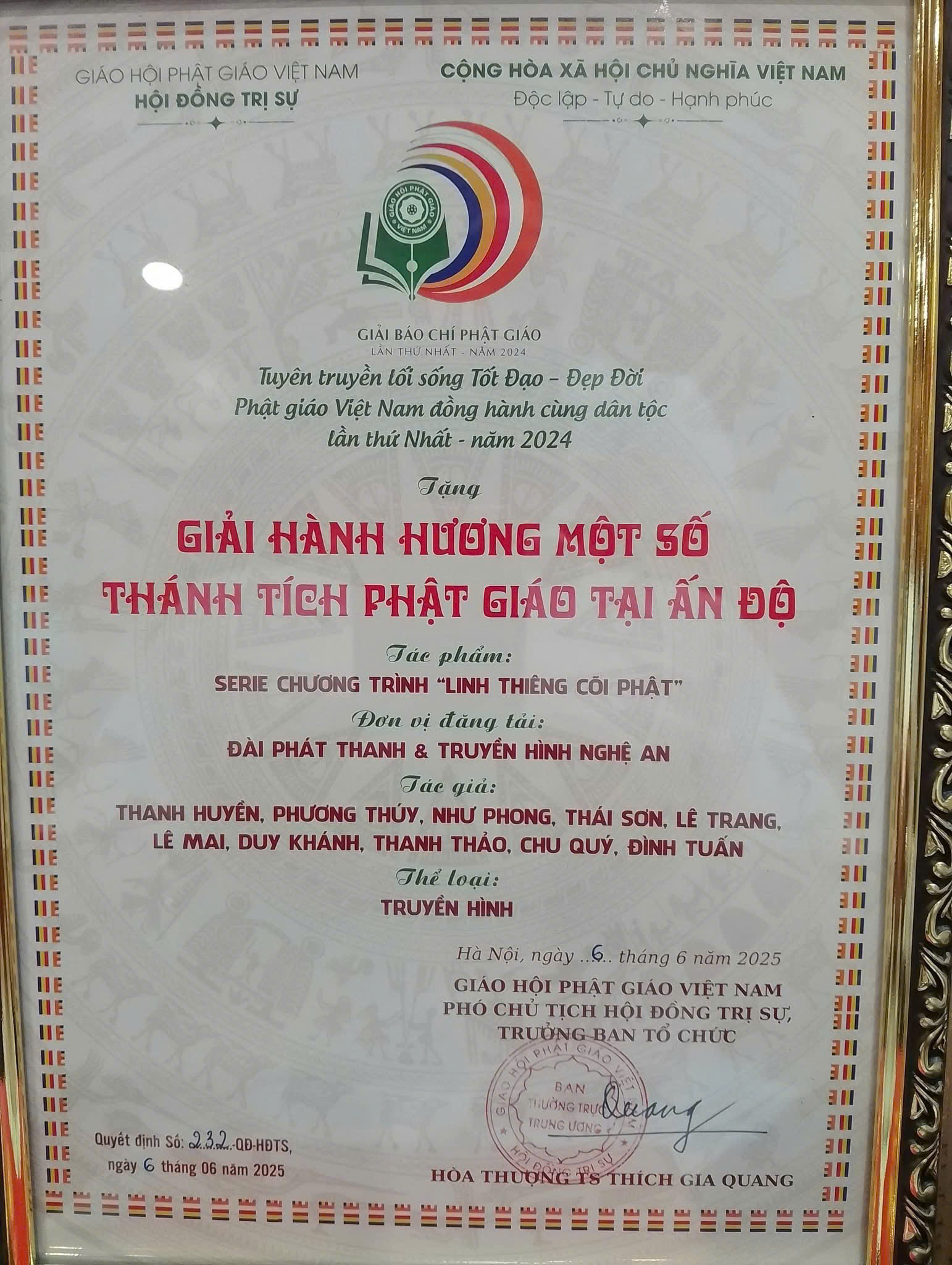 Đặc biệt, tác phẩm “Linh thiêng cõi Phật” của nhóm tác giả: Thanh Huyền - Phương Thúy- Như Phong - Thái Sơn - Lê Trang - Lê Mai - Duy Khánh - Thanh Thảo - Chu Quý - Đình Tuấn, Đài PTTH Nghệ An gây ấn tượng mạnh mẽ bởi mỗi tập phim là một lát cắt tinh tế, tái hiện hành trình đồng hành của Phật giáo cùng lịch sử, văn hóa và tâm hồn người Việt – nhất là tại Nghệ An, vùng đất từng sớm tiếp nhận ánh sáng từ cửa Phật. Sự ghi nhận này là niềm tự hào của NTV, đồng thời là lời tri ân sâu sắc đối với những giá trị nhân văn, tâm linh mà Phật giáo mang lại cho dân tộc.