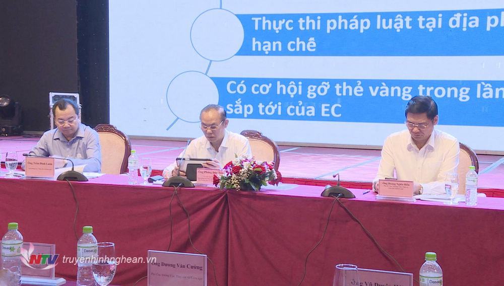 Các đồng chí: Phùng Đức Tiến - Thứ trưởng Bộ Nông nghiệp và Môi trường, Phó trưởng Ban chỉ đạo Quốc gia về IUU; Hoàng Nghĩa Hiếu - Phó Bí thư Thường trực Tỉnh uỷ, Chủ tịch HĐND tỉnh Nghệ An và Trần Đình Luân, Cục trưởng cục Thuỷ sản và Kiểm ngư đồng chủ trì.