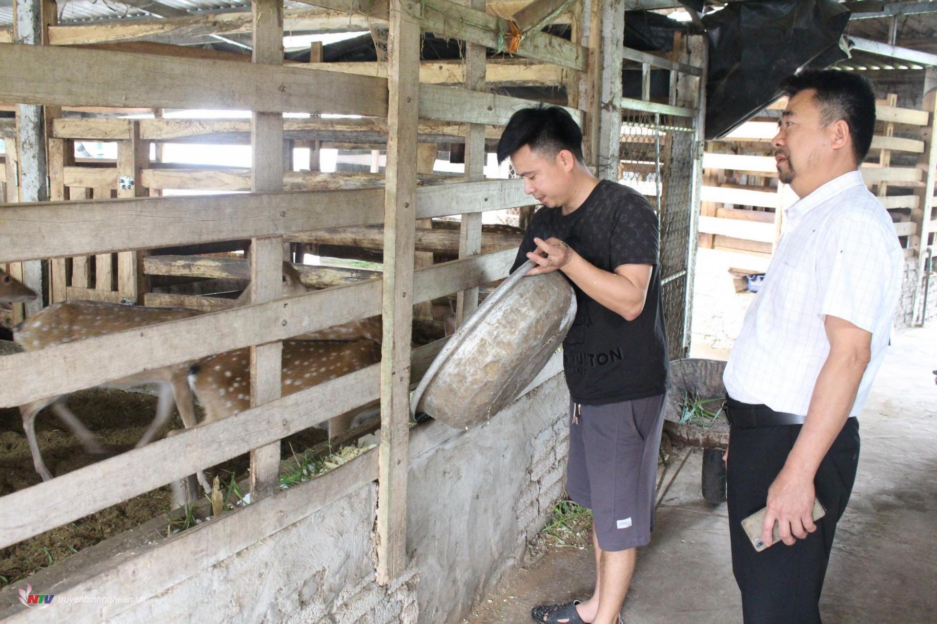 | Ông Hồ Bá Xuyên, xã Quỳnh Bảng trao đổi về mô hình nuôi hươu lấy nhung bằng thảo dược. |