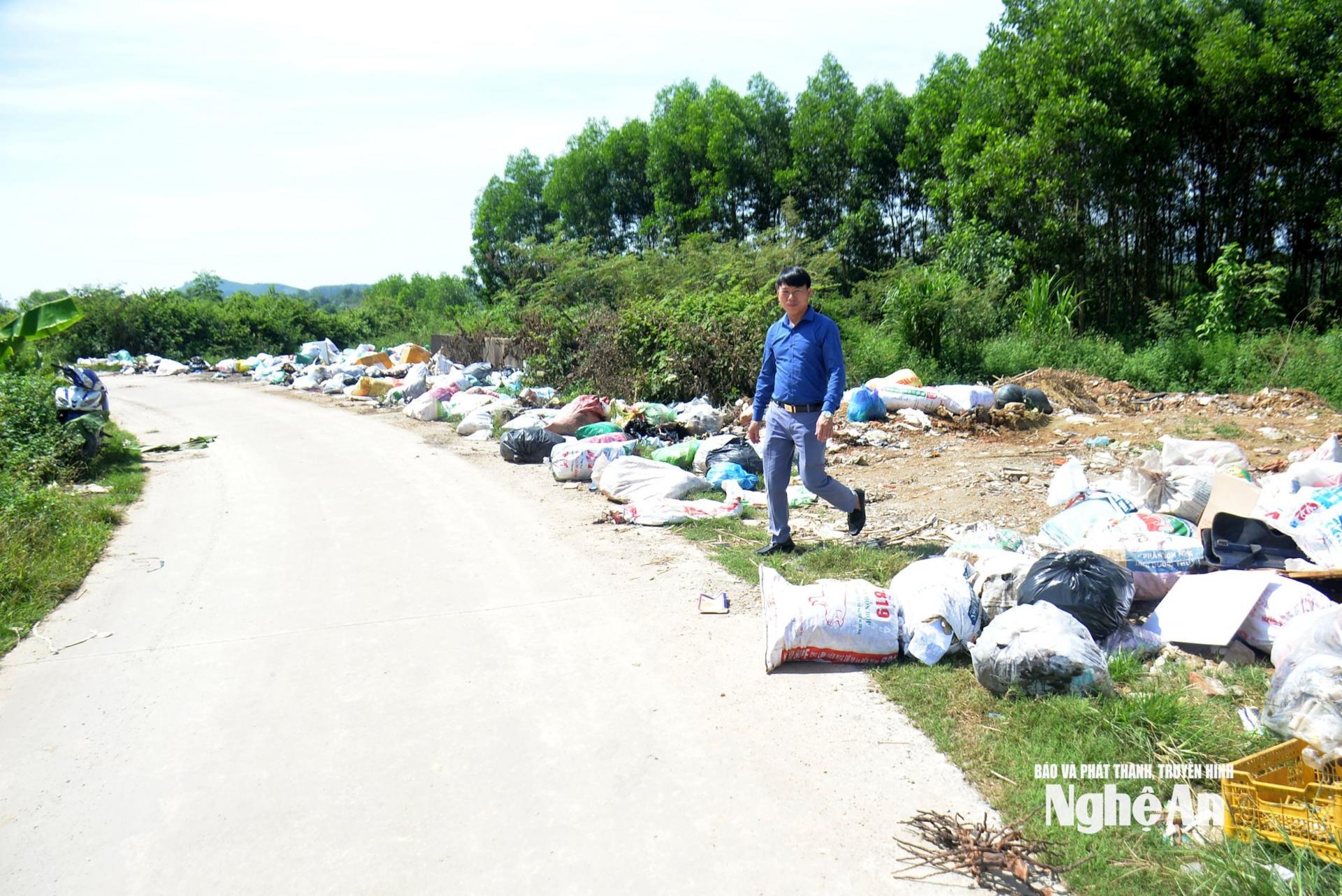| Ông Lê Văn Tý - Phó Chủ tịch UBND xã Hoa Quân nắm tình hình xác lợn vứt tại điểm tập kết rác trên địa bàn xã để kịp thời xử lý. Ảnh: Xuân Hoàng |