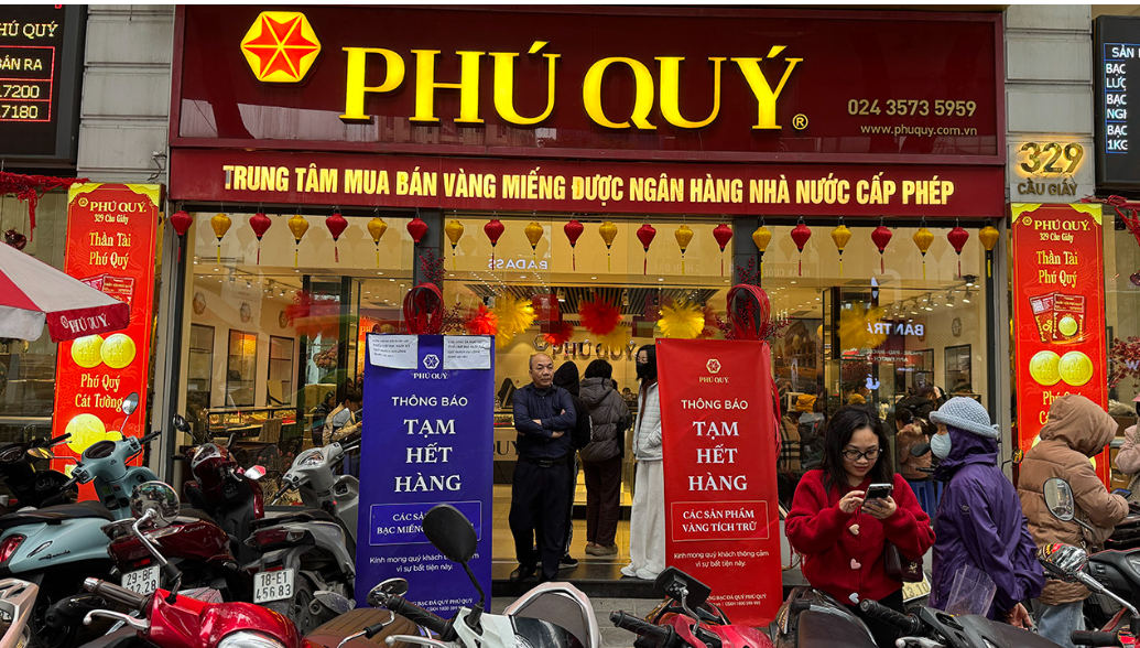 Tại cửa hàng vàng Phú Quý trên đường Cầu Giấy, từ sáng sớm cửa hàng đã thông báo tạm hết sản phẩm vàng. Với sản phẩm bạc, chỉ những khách hàng có phiếu mới được vào giao dịch. Cửa hàng đã phát hết phiếu đặt bạc ngày 2/2.