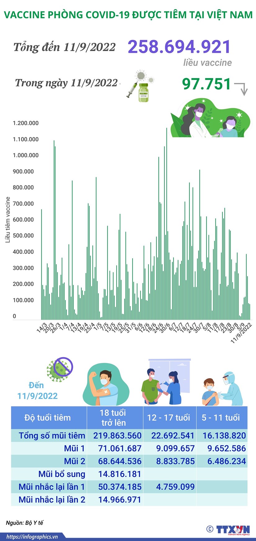 Trong ngày 11/9/2022 có 97.751 liều vaccine phòng COVID-19 được tiêm. Như vậy, tổng số liều vaccine đã được tiêm tại Việt Nam là 258.694.921 liều trong đó tiêm cho trẻ từ 5-11 tuổi là 16.138.820 liều, tiêm cho trẻ từ 12-17 tuổi là 22.692.541 liều và tiêm cho người từ 18 tuổi trở lên là 219.863.560 liều./.