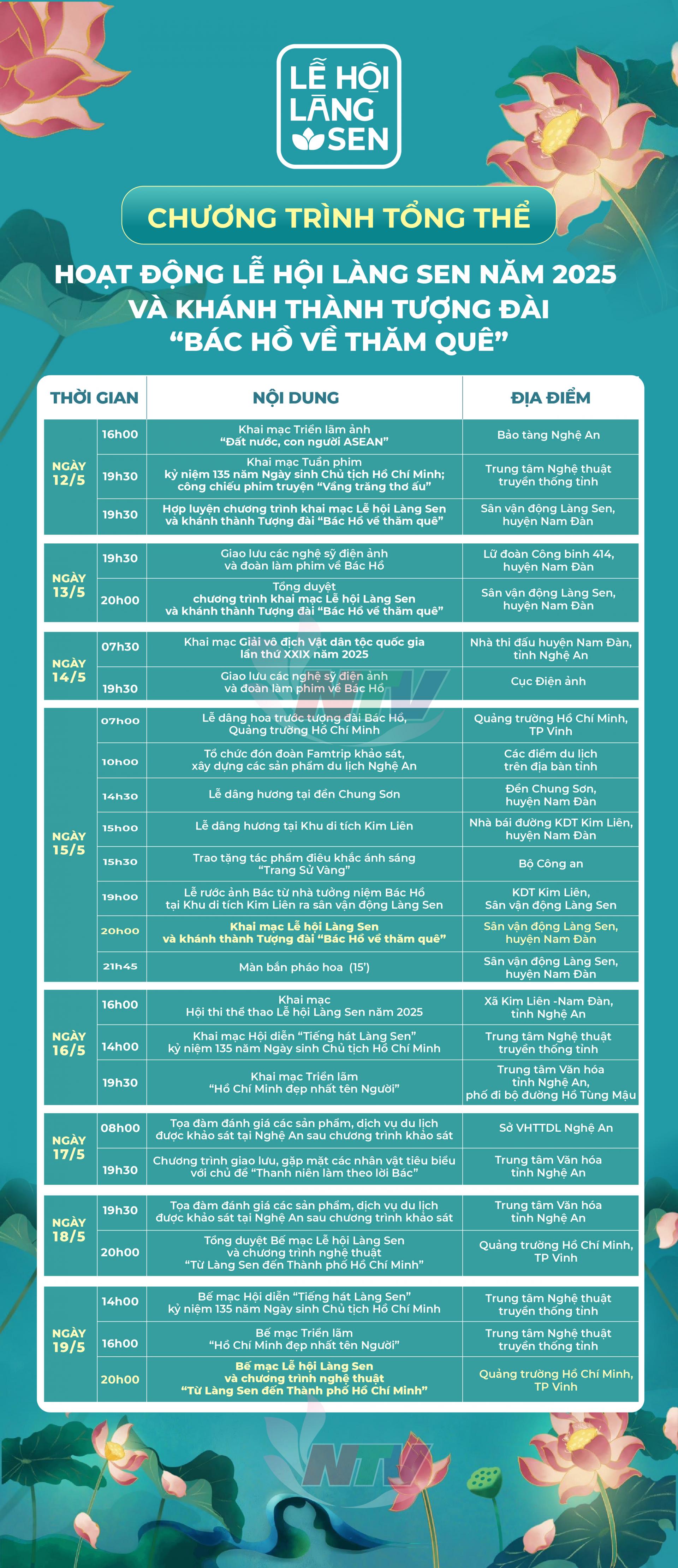Lễ hội Làng Sen năm 2025 diễn ra từ ngày 12-19/5 tại thành phố Vinh và huyện Nam Đàn, Nghệ An được tổ chức quy mô cấp quốc gia với nhiều hoạt động phong phú, đặc sắc chào mừng kỷ niệm 135 năm Ngày sinh Chủ tịch Hồ Chí Minh (19/5/1890-19/5/2025).