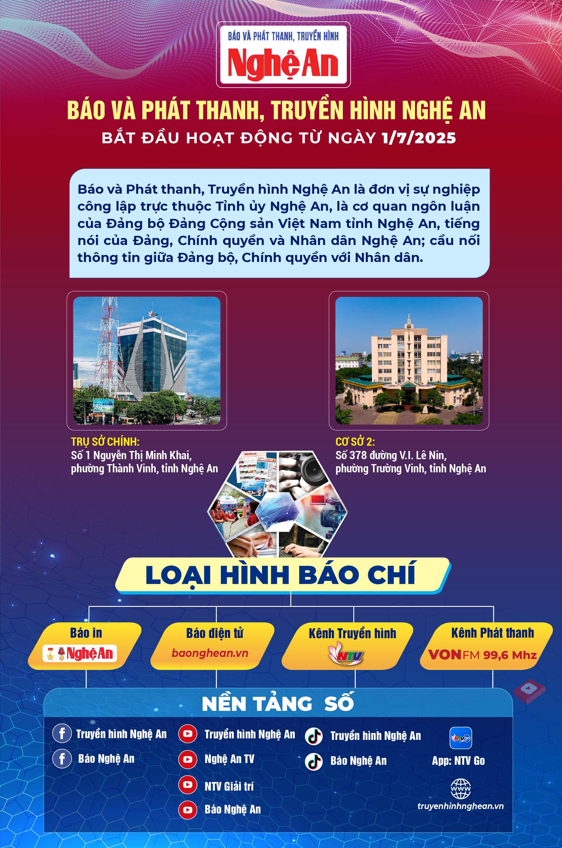 Từ ngày 1/7/2025, sau khi hợp nhất, Báo và Đài Phát thanh - Truyền hình Nghệ An là cơ quan báo chí truyền thông đa phương tiện, đa loại hình, đa nền tảng, lấy chất lượng nội dung là cốt lõi, ứng dụng công nghệ là bệ đỡ và nguồn nhân lực là trung tâm của sự phát triển.