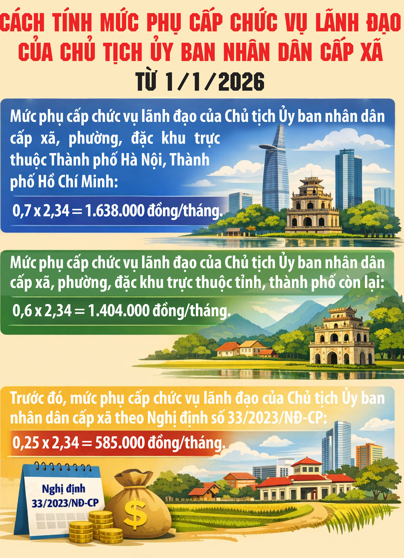 Theo đó, từ ngày 1/1/2026, hệ số phụ cấp chức vụ lãnh đạo của Chủ tịch Ủy ban nhân dân cấp xã tăng từ 0,25 lên 0,7 đối với xã, phường, đặc khu trực thuộc thành phố Hà Nội, Thành phố Hồ Chí Minh và 0,6 đối với xã, phường, đặc khu trực thuộc tỉnh, thành phố còn lại.